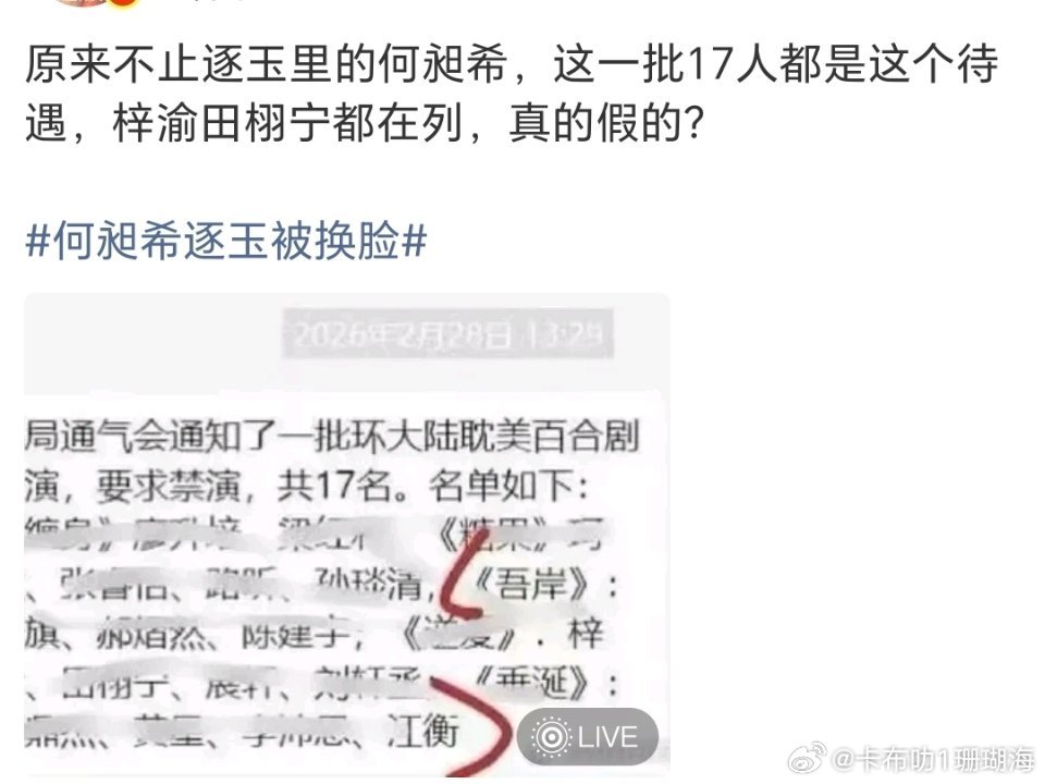 还大陆制片人应何昶希逐玉被换脸破防大骂(P1),同时还有网曝不止何昶希还有其它17名演员会被要求禁演,包括当下很火的梓渝和田柠宁。