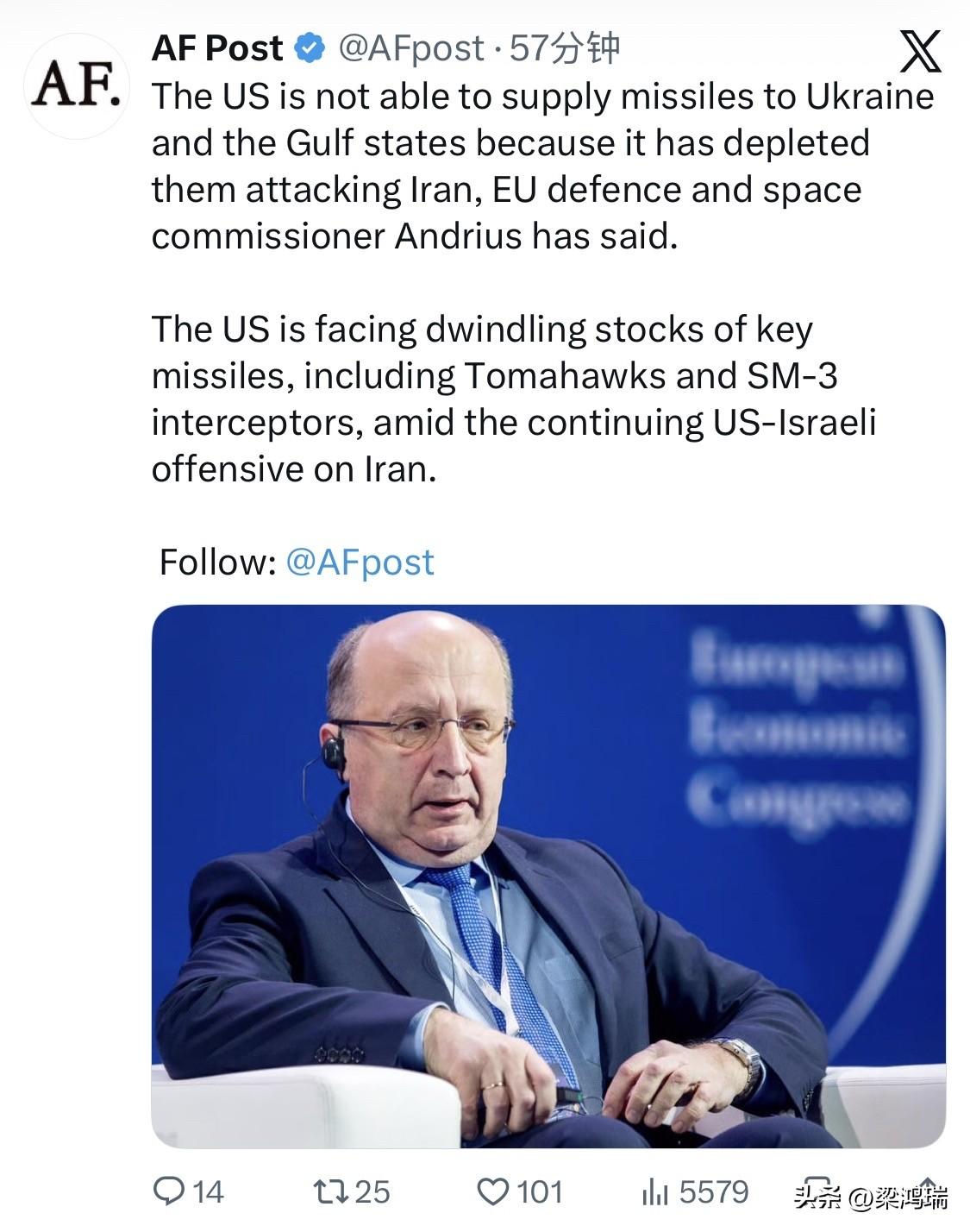 欧盟国防和航天专员安德留斯·库比柳斯(Andrius Kubilius)表示,美国无法向乌克兰和海湾国家提供导弹,因为它在攻击伊朗的过程中耗尽了这些导弹。 由于美以对伊朗的持续攻势,美国正面临包括战斧导弹和SM-3拦截导弹在内的关键导弹库存不断减少的困境。 安德留斯·库比柳斯(Andrius Kubilius)是现任欧盟国防和航天专员(European Commissioner for Defence and Space)。他是立陶宛前总理,并在 2024 年被任命为欧盟委员会历史上首位专门负责国防事务的专员。
