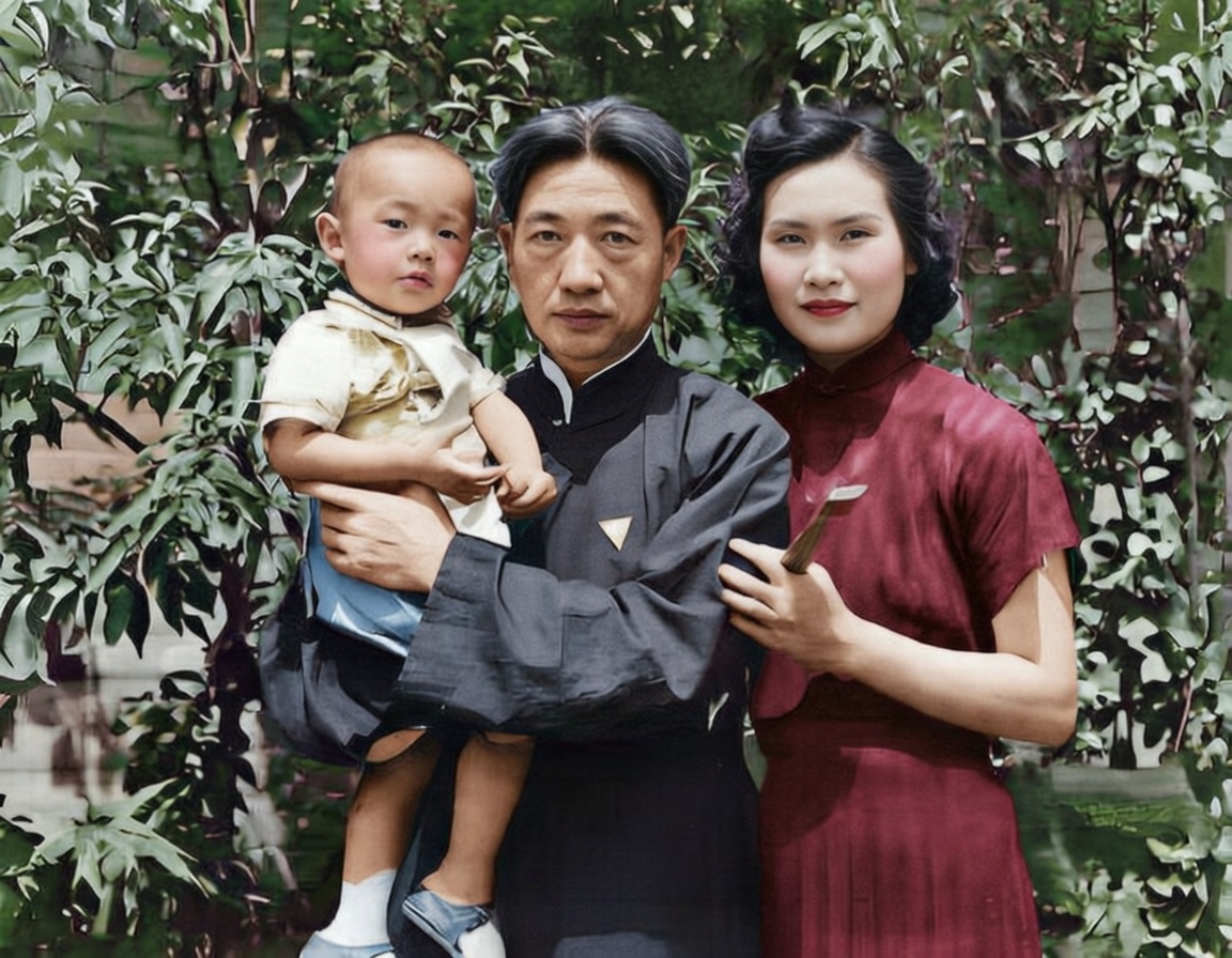 这张照片是中国现代美术教育奠基者徐悲鸿与第二任妻子廖静文以及他们的儿子徐庆平的合影,拍摄于20世纪40年代末。 徐悲鸿身着中式长衫,神情沉稳,正怀抱着年幼的儿子,廖静文身着旗袍,温婉地站在一旁,是徐悲鸿晚年重要的伴侣与事业支持者。此时,徐悲鸿正担任国立北平艺术专科学校(中央美术学院前身)校长,与廖静文、儿子徐庆平、女儿徐芳芳定居在东受禄街16号的四合院中,这张照片正是在他们的家中庭院里拍摄的。