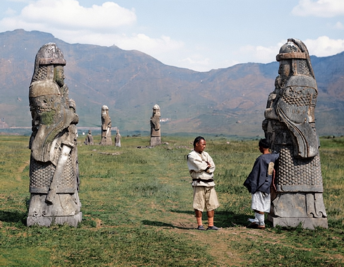 这张照片,由苏格兰摄影师约翰·汤姆逊于1871-1872年**在南京明孝陵拍摄,定格了晚清明孝陵神道上的一幕,与今日游人如织的景象截然不同。 照片中的是明孝陵神道上的武将翁仲石像,这些石像高约3米,身披铠甲,手持骨朵,是明代石刻艺术的杰作。在照片中,它们矗立在空旷的荒野中,显得格外高大肃穆。两名身着短打、留着长辫的晚清男子站在石像旁,一人抱臂而立,另一人则好奇地触摸石像。 连绵的紫金山,神道两侧没有如今的参天古木,只有低矮的荒草和泥土路,远处甚至可见农家屋舍。明孝陵作为明代开国皇帝朱元璋的陵寝,在清代已失去了皇家陵寝的威严。清廷既无力也无心维护,导致其逐渐荒废,沦为荒野。