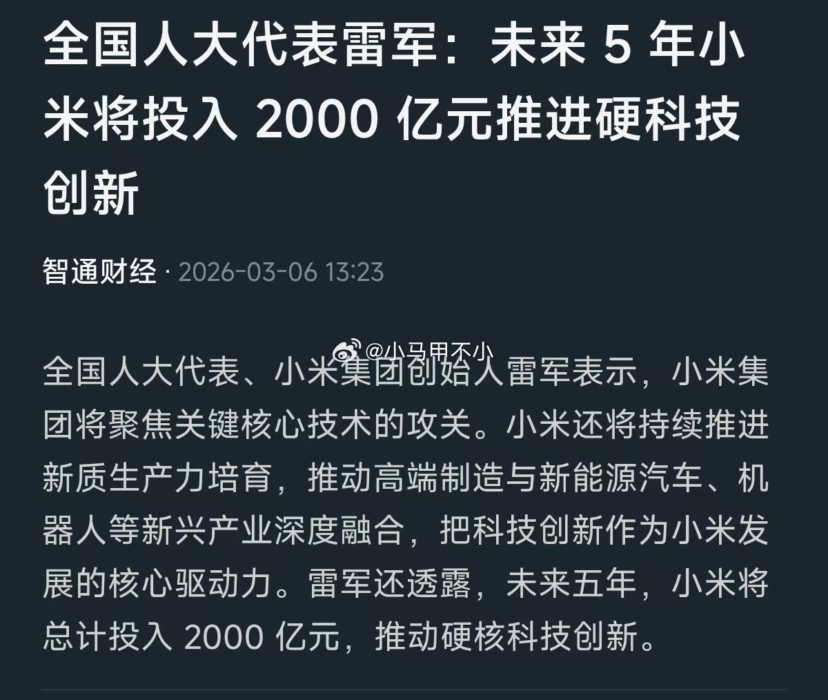 雷军:小米将持续推进新质生产力培育,推动高端制造与新能源汽车、机器人等新兴产业深