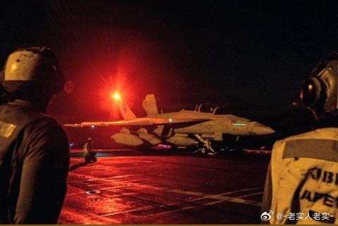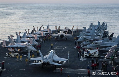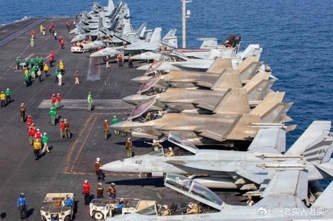 执行对伊朗空袭的林肯号航母甲板情况,可见肥电和大黄蜂挤成一团,以及大量的杰达姆炸