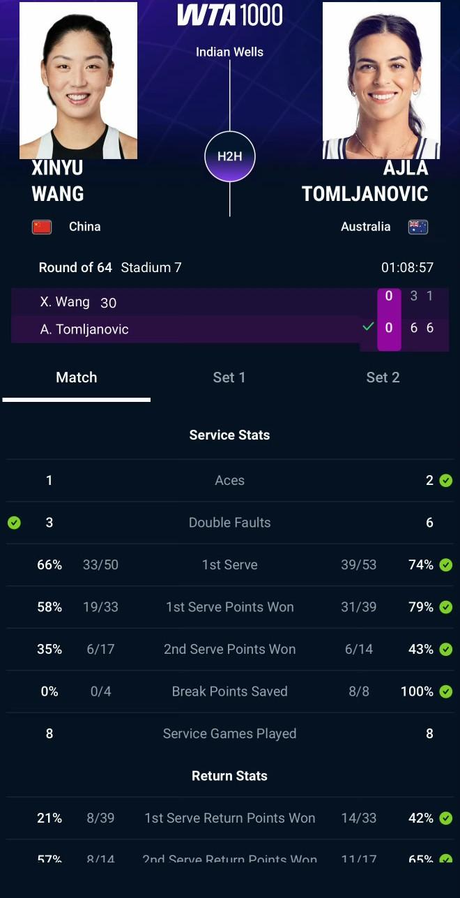 本来澳洲赛季状态挺好的,不知道这段时间王欣瑜是怎么了? IW1000赛第二轮,作为30号种子的王欣瑜状态不佳,全场获得8个破发点,一个都没破。 最终3-6/1-6不敌汤姆贾诺维奇横扫,无缘32强。 王右收获10分、36110美元,即时排名:33(-3)。