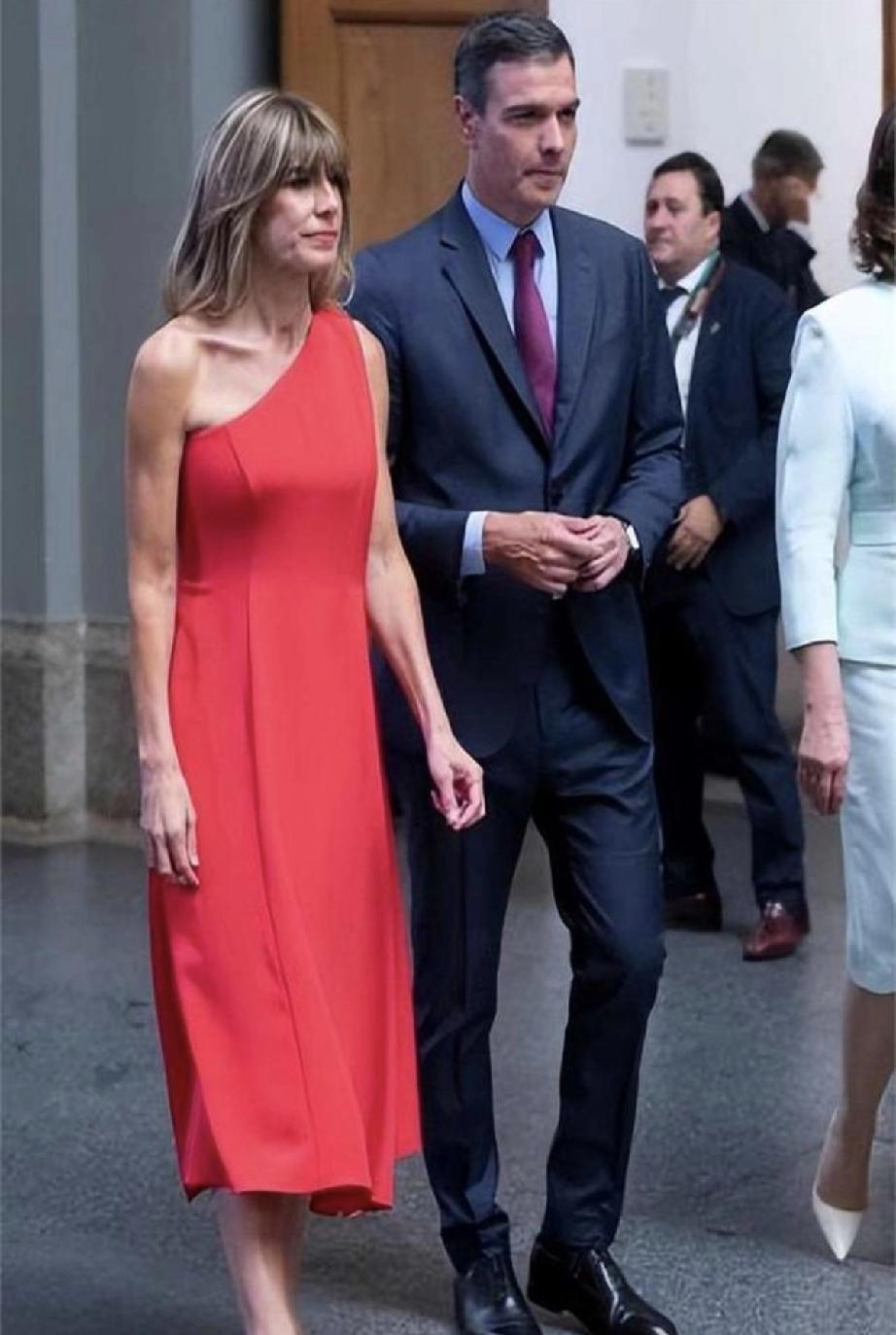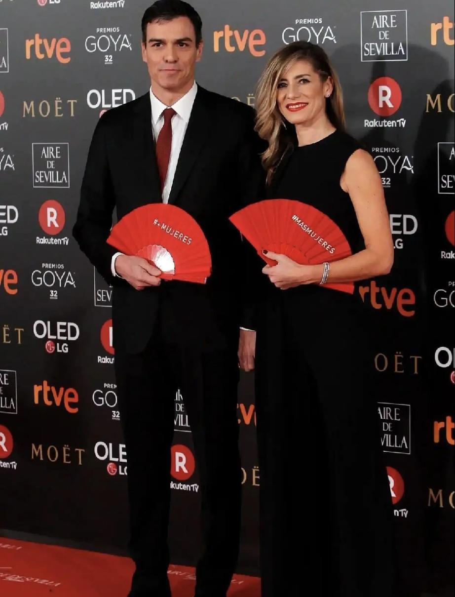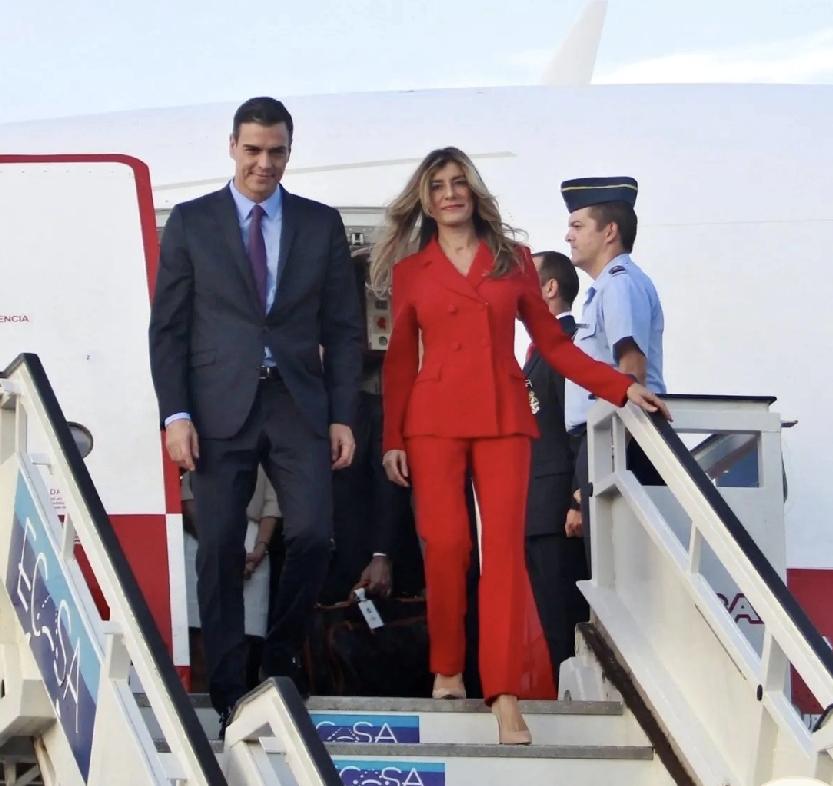 西班牙首相桑切斯的夫人叫戈麦斯。 穿红装的戈麦斯美的不像话,是人群里一道靓丽的风景线。 桑切斯夫妇穿的衣服是黑色的,手里还各自拿了一把红色的扇子。 红红的颜色的确很亮眼。