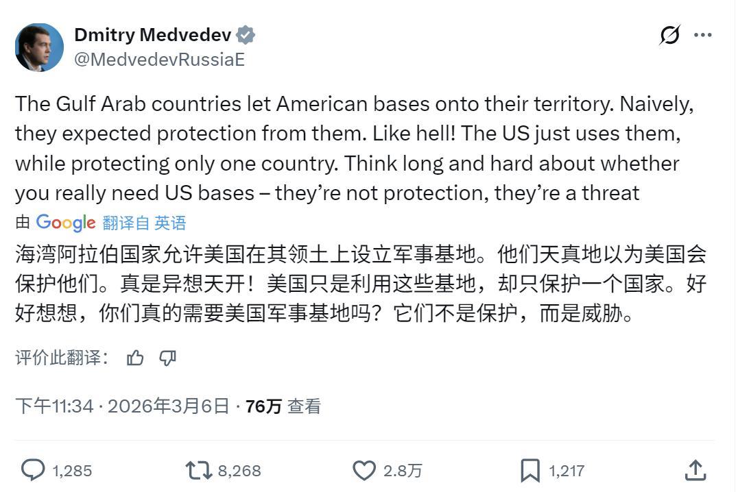 俄罗斯前总统梅德韦杰夫3月6日,发文写道:“海湾阿拉伯国家允许美国在其领土上设立军事基地。他们天真以为美国为保护他们。真是异想天开!美国却只利用这些基地,保护另一个国家。好好想想,你们真需要美国军事基地吗?它们不是保护,而是威胁。” 梅德韦杰夫说:“美国设在海湾国家的军事基地,不是保护,而是威胁!” 其实,从这次美以对伊朗发动军事行动中,可以看出是有一定道理的。当伊朗遇袭采取军事反击时,主要也连滞打击美国设在海湾国家美国的军事基地,比如阿联酋、巴林、科威特、卡塔尔等均遭伊朗军事打击,美国却不能保护他们安全。还有最关键的是当危险来临时,美国优先撤离自己资产及人员,惹祸上身后把危险留给有美国军事基地的阿拉伯国家,还有更严重的是,最关键时刻美国还从海湾国家调走防空导弹系统去保护某些国家。所以说梅德韦杰夫说美国所设的军事基地是威胁、不是安全是有一定道理的。