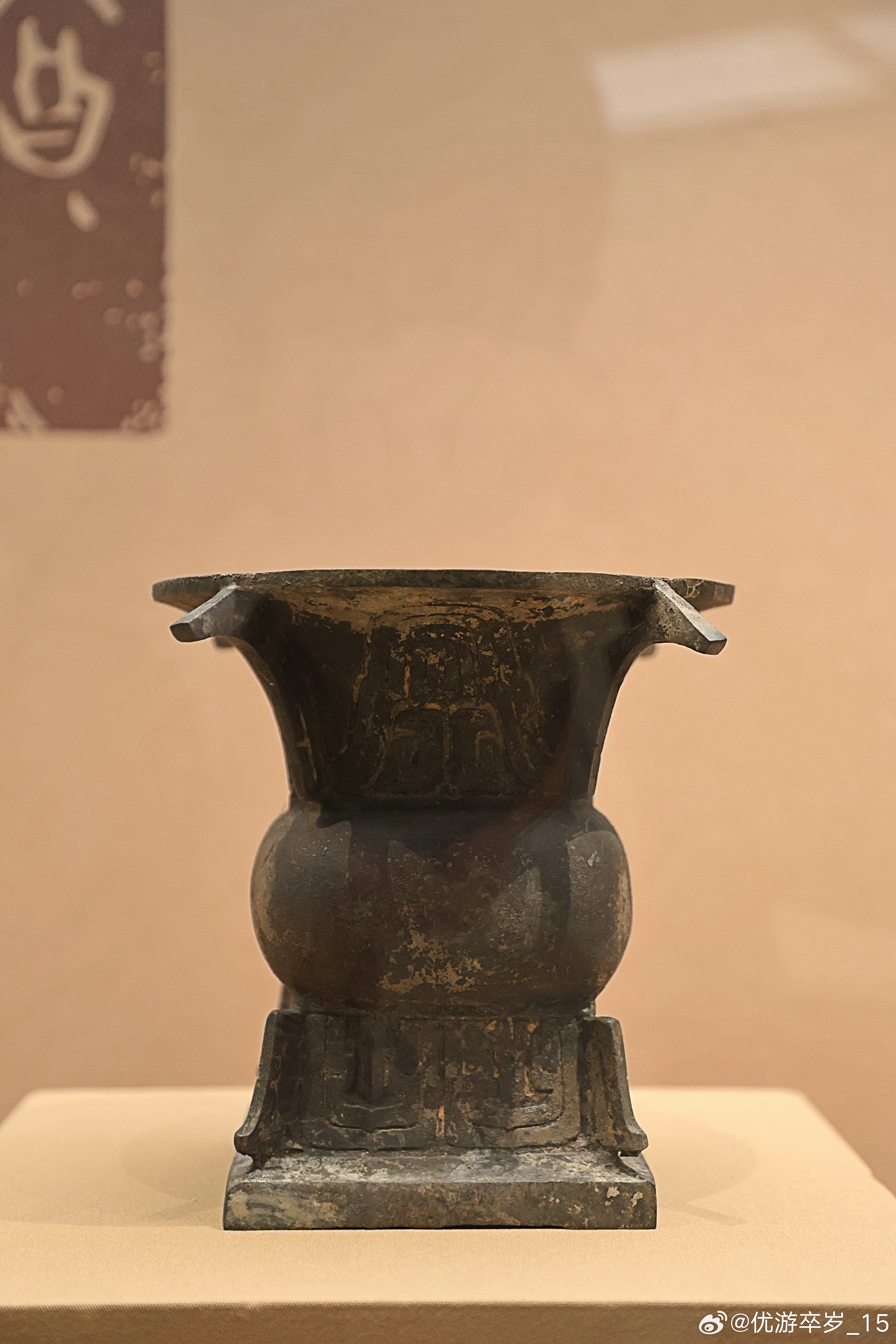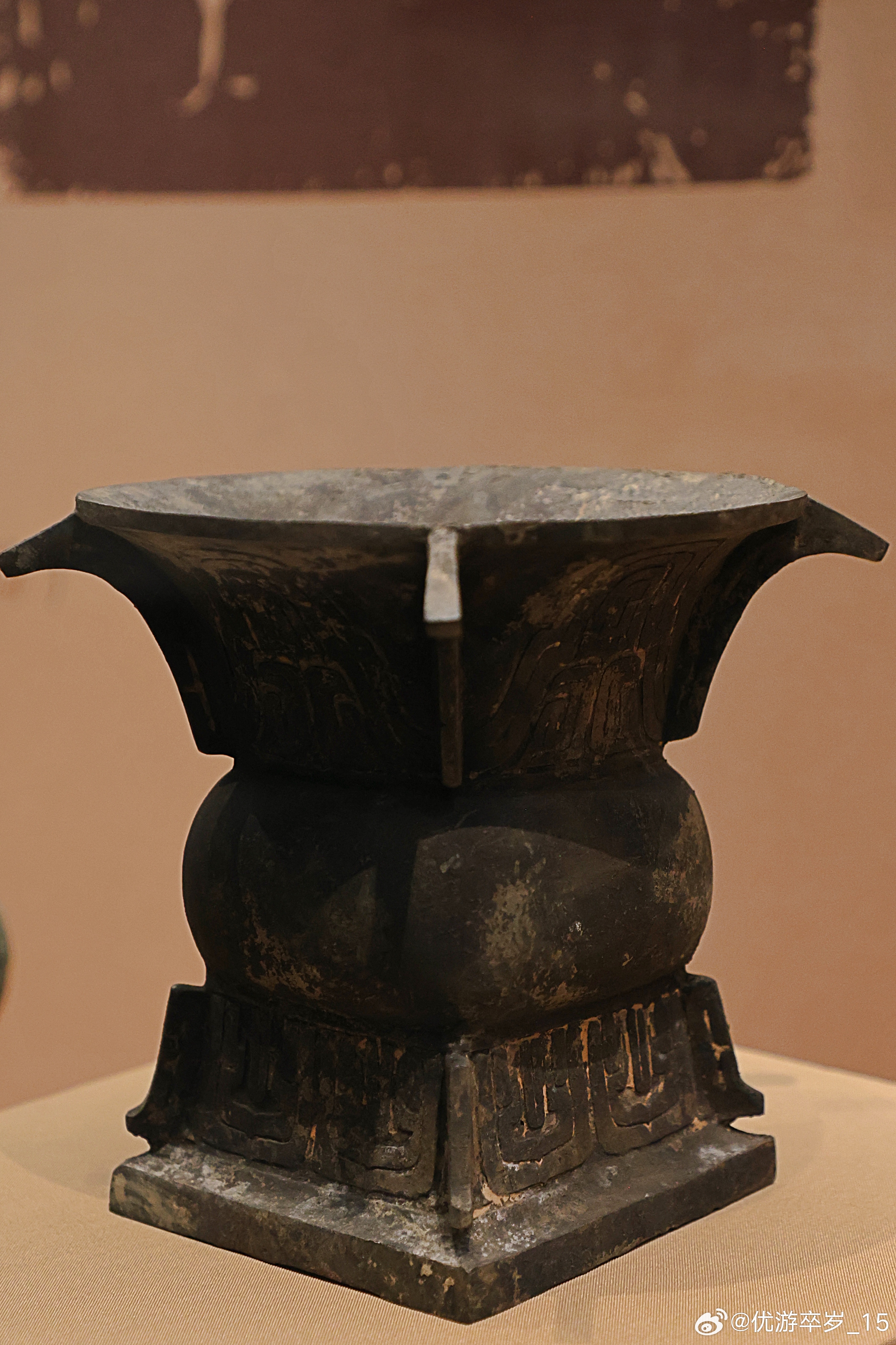 我的2026 【中国之中-中原古代文明精粹】铜尊西周(公元前1046-前771年)河南南水北调博物馆藏南阳夏晌铺墓地出土。敞口,束颈,鼓腹,平底。四方形高圈足,足沿宽折,承托整个器身。颈部与方形圈足的四隅,各装饰一道的扉棱,棱脊顶端斜向下延伸。清华大学艺术博物馆展出2026.2.8约会博物馆 文物