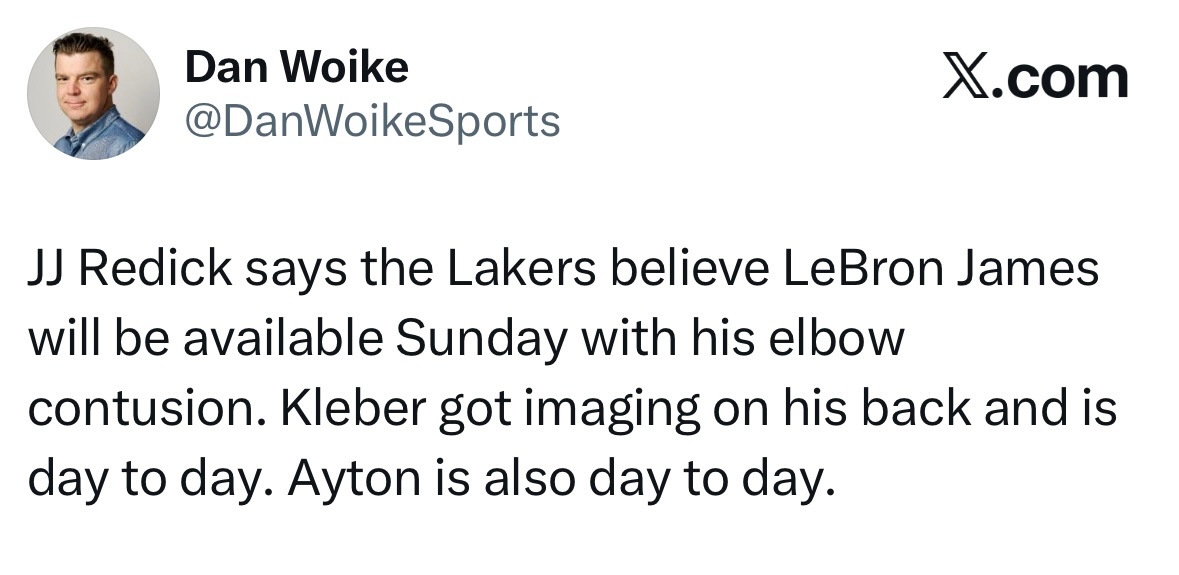 雷迪克表示,湖人队相信詹姆斯的肘部挫伤无碍,能够出战周一对阵尼克斯的比赛。