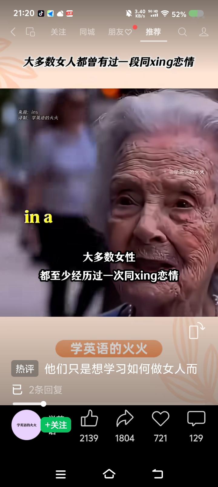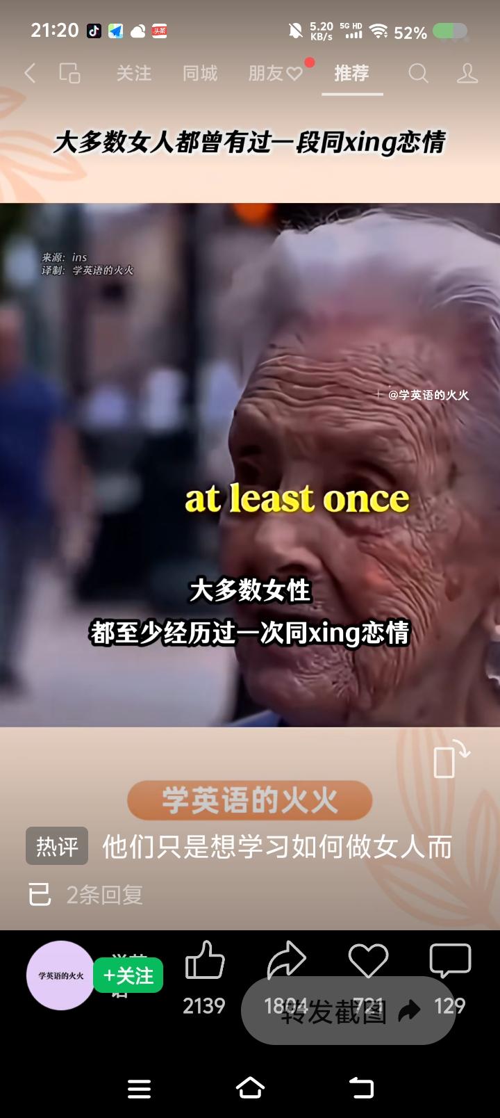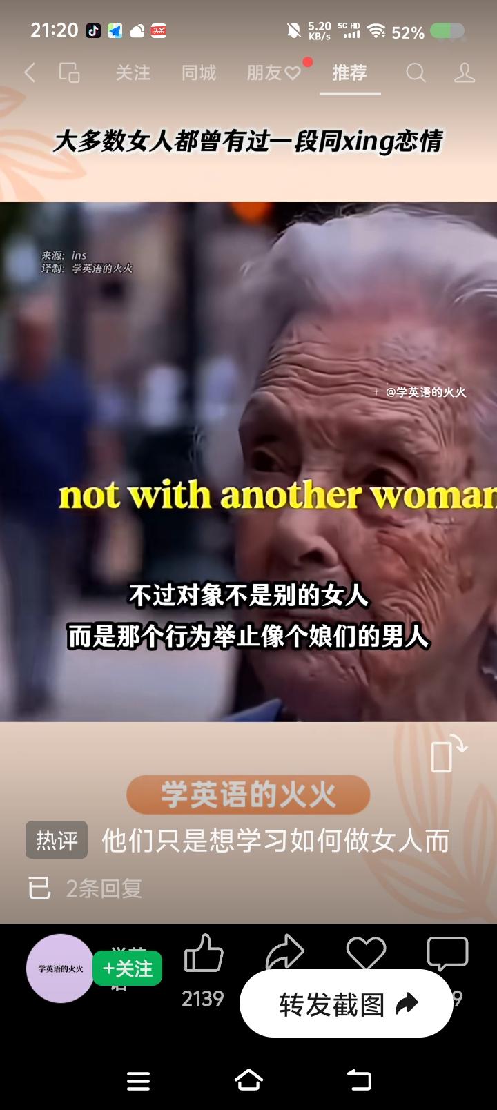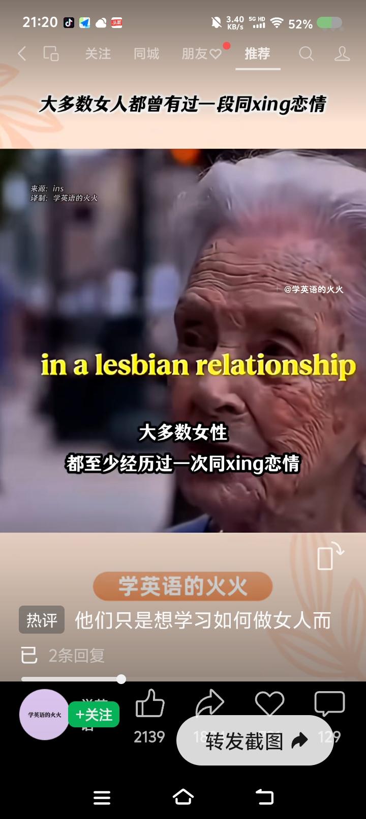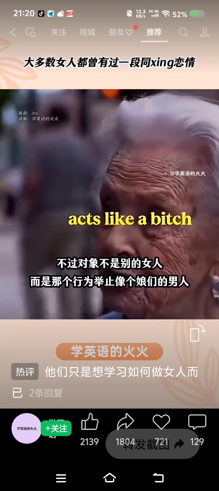 有人欺负我不懂英语?—— 网上视频:一个外国人说:“大多数女性,一生至少经历一次同性恋情,不过不是和别的女人,而是和行为举止像个娘men的男人。” 点评: 有英文字幕,最后几个单词是“acts like a bitc-h”。 我英语不好,但最后这个单词一出现,我认为译文不对。