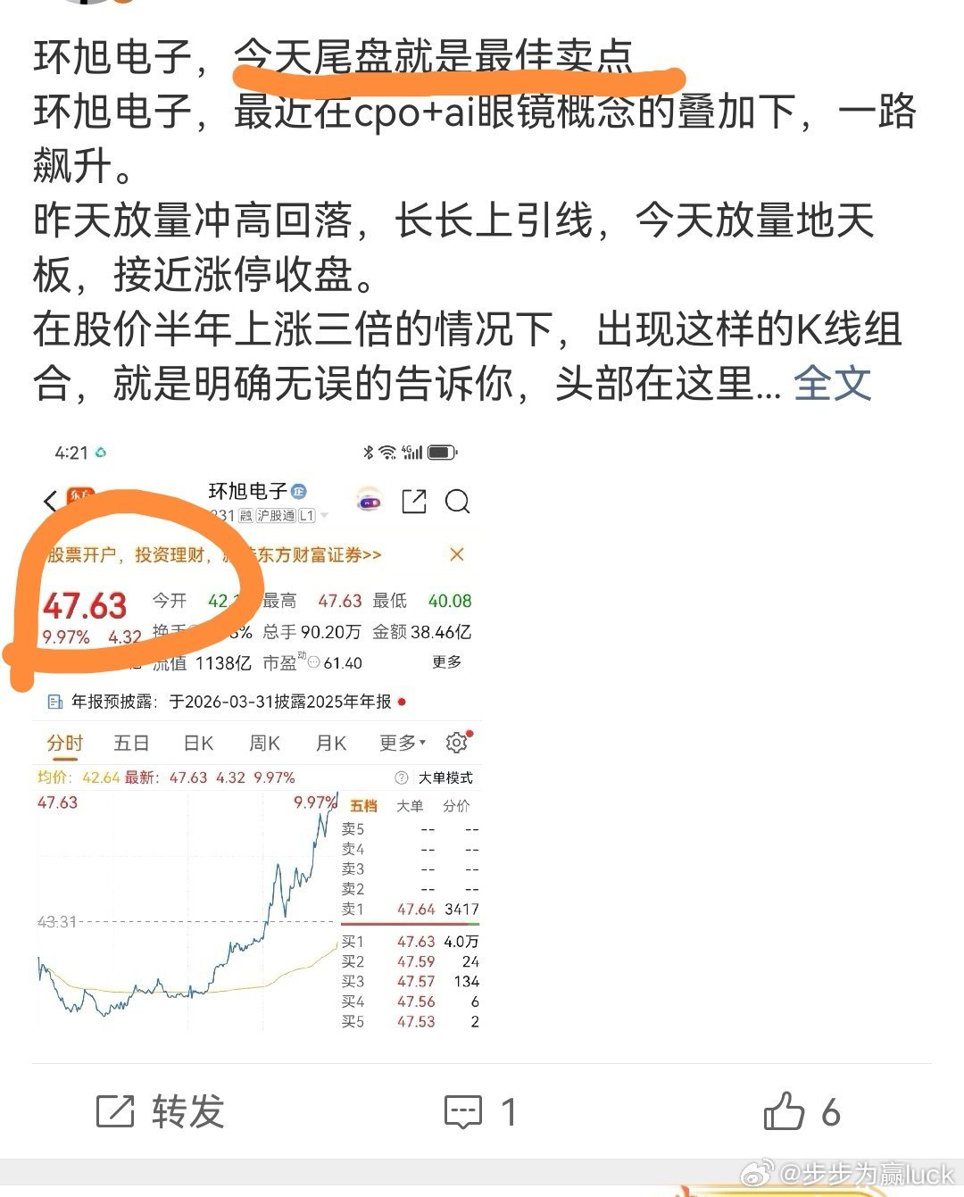 环旭电子,听劝的朋友都已经安全撤退了环旭电子,告诉大家一个事实,就是千万不要迷信反包,反包是一定要看位置的。环旭电子,2月26日放量冲高回落,2月27日海底捞月涨停反包,3月2日又给了一次机会。反包,其实是一种洗盘的动作,但是我为什么要在2月27日尾盘提示大家要及时离场,原因很简单,就是高位无反包。一个股票,三个月涨了三倍,还洗什么盘啊!再回来看看这几天的走势,3月3日、4日的大跌,可以说是被大盘拖累的,但是3月5日、6日,大盘连续两天反弹,他依然是坚定的下跌,这就是去意已决了。接下来会不会有反弹,回答是肯定的,但是反弹的时间和强度是无法预知的。有反弹就减仓,目前大概率是在半山腰,主力大爷下周反弹一下,给里面的人减减亏吧。欢迎加入我们的免费交流群财经股票