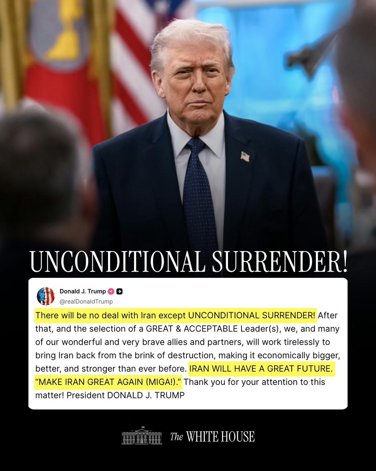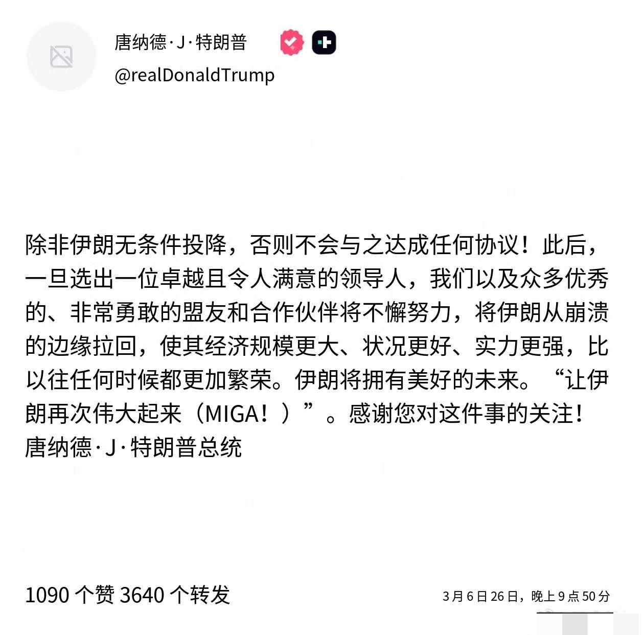 特朗普:伊朗唯一的选择就是“无条件投降! “之后,在选出一位伟大且可接受的领导人之后,我们以及我们众多杰出而勇敢的盟友和伙伴将不懈努力,使伊朗摆脱毁灭的边缘,使其经济比以往任何时候都更加繁荣、强大。” “伊朗必将拥有美好的未来。” “让伊朗再次伟大(MIGA!)” ——唐纳德·J·特朗普总统,白宫 这看似是特朗普描绘的一幅美好蓝图,但实际上不过是美国霸权主义的又一幻想。所谓“无条件投降”,这是美国一贯的强硬姿态,试图以武力和制裁为手段去迫使伊朗屈服。然而,伊朗并非任人拿捏的软柿子,其有着悠久的历史和坚韧的民族精神,这次美国幻想接管伊朗政府的美梦恐怕要破灭了!
