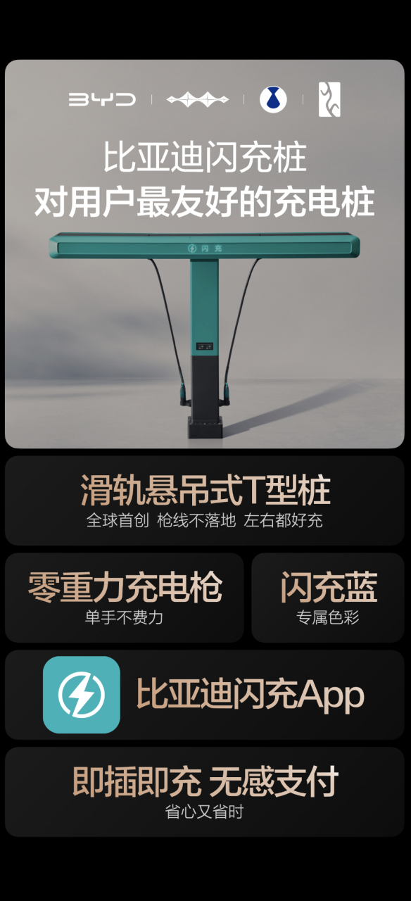 值得一提的是,比亚迪闪充桩采用了全球首创的“滑轨悬吊式T型桩”设计,让线拉着枪,充电枪取放轻如“零重力充电枪”,线缆永不拖地,告别脏污;而且不管你的车充电口在左边还是右边,滑轨设计都能轻松移动。解决了传统公共充电桩枪重、线脏、移动不灵活,充电流程还很繁琐的痛点。