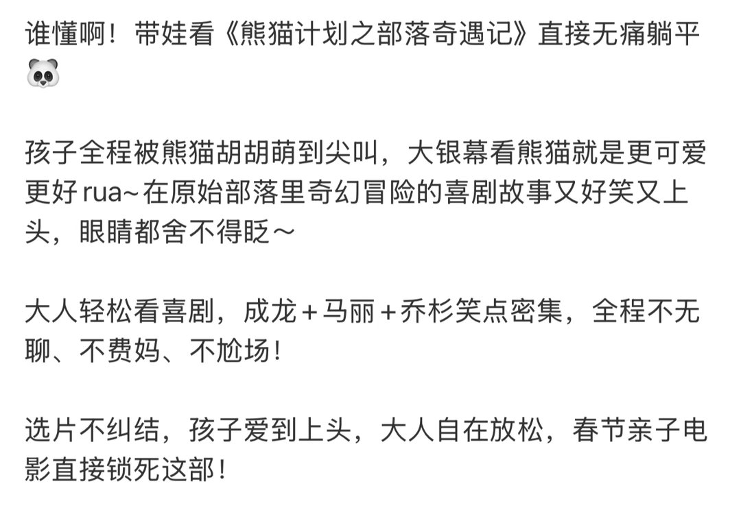 速速列入萌娃开学必备清单 新学期第一天就有学校组织去看《熊猫计划之部落奇遇记》,孩子们被熊猫胡胡萌得哈哈大笑。用这种欢乐的方式开启新学期,确实比硬邦邦的说教管用多了。