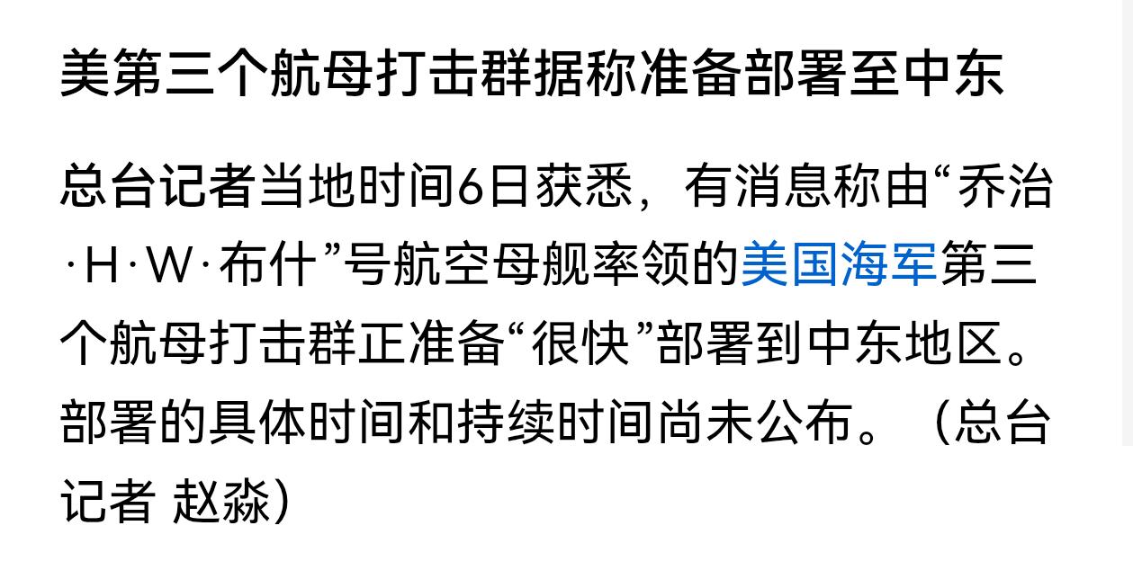大家最期待的消息来了! 美国正在部署第三个航母打击群到中东,这说了什么?进一步证实了林肯号航母确实被伊朗给打到了,目前林肯号航母已经撤离中东地区,而这个时候却又派另一艘航母打击群去中东,说明老美心理有鬼!林肯号应该是出问题,只剩福特号在中东应付不了后面的局势,必须的两艘航母打击群,所以得再派一艘前去! 尽管老美把林肯号航母被打击的事,捂得严严实实,但是各种消息都证明了被打击的事实!