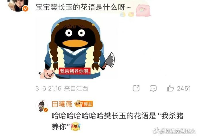 田曦薇说樊长玉的花语是我杀猪养你田曦薇回应樊长玉的花语 田曦薇在回应樊长玉的花语时,用“我杀猪养你”来概括,既贴合《逐玉》中樊长玉的角色设定,又充满反差萌,让人深深觉得田曦薇太有梗,也感受到她对角色的细腻解读。