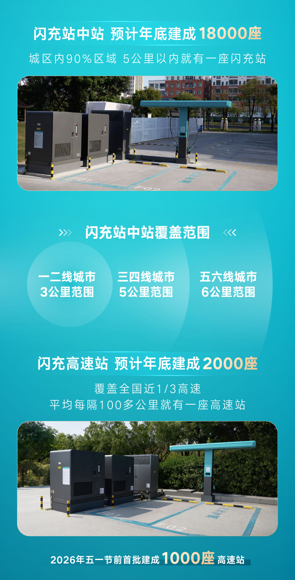 建站也相当疯狂,闪充中国战略的目标是——年底建到20000座闪充站,覆盖90%城区、近三分之一高速服务区。五一前先落地1000座高速站,假期出行不焦虑。