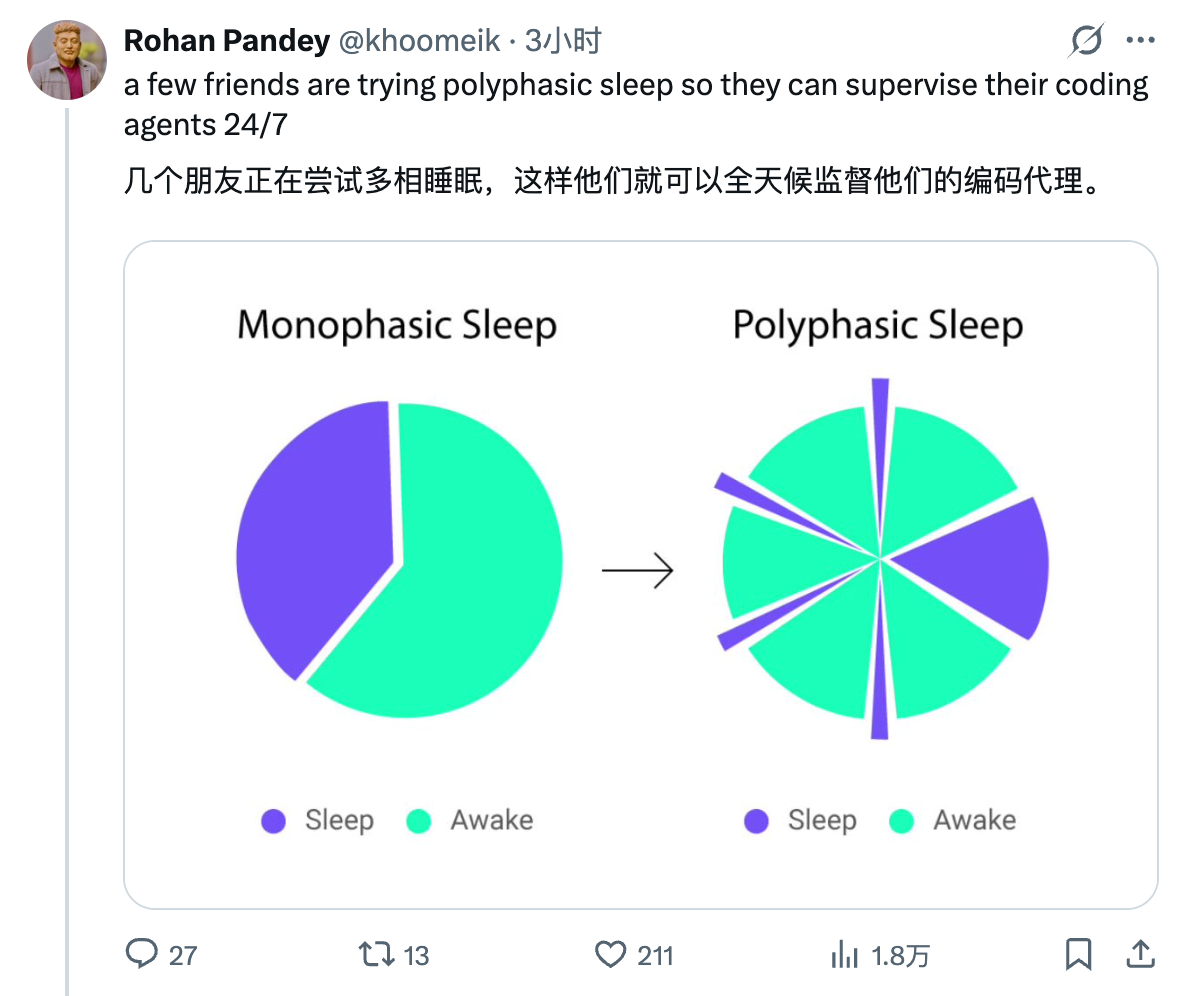刷到一条推说因为大家正在把 coding Agent 融入工作流,为了能 24 小时不间断跑,很多人在尝试多相睡眠,也就是一觉分成四五觉,睡睡醒醒醒醒睡睡。