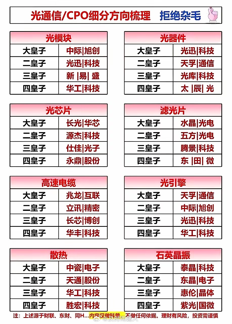 五五”开局之年,科技主线与高端制造的投资脉络已清晰!从太空算力、商业航天到可控核聚变,从AI核心硬件到电网设备全产业链,这几张图把未来几年的核心赛道和龙头标的梳理得明明白白。无论是光通信CPO的细分龙头,还是固态电池、脑机接口的前沿突破,都藏着下一轮行情的密码。收藏好这份硬核清单,紧跟政策东风,把握时代红利!AI算力爆发,光通信/CPO成核心赛道!这张图把光模块、光器件、光芯片等细分领域的龙头梯队梳理得清清楚楚,行业龙头代表中际旭创、光迅科技、兆龙互连、天孚通信等等值得关注。AI浪潮席卷,核心硬件是算力底座!这张图把光纤光缆、AI变压器、金刚石散热等六大核心硬件赛道的龙头标的一网打尽,从上游材料到关键设备行业龙头代表有长飞光纤、中材科技等等。⚠️风险提示:以上内容仅作行业科普,不构成任何投资建议。市场有风险,投资需谨慎。