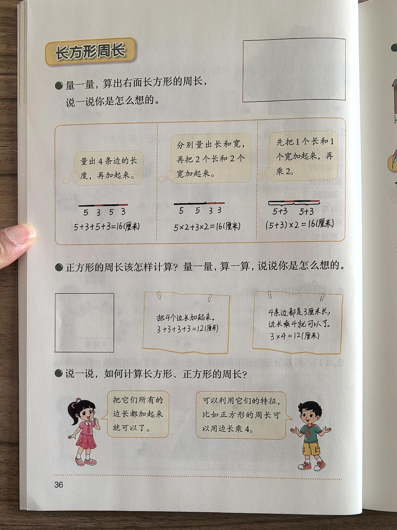 北师大版三年级下册学生表现层级(长方形、正方形周长教学) 结合“量边长算周长”的学习,学生表现细化为3类: - 表现1 - 行为:计算长方形周长时,只量1条长和1条宽,却直接加起来(如5+3=8厘米,认为是周长);计算正方形周长时,量1条边后不会乘4,或把4条边量错(如量成3、3、2、2)。 - 思维:没理解“周长是所有边长的和”,也没建立“长方形对边相等、正方形四边相等”的特征与周长计算的联系。 - 问题:对“周长的定义”和“图形边的特征”核心概念模糊。 - 表现2 - 行为:能通过“量4条边相加”算出长方形/正方形周长,但不会用“对边相等/四边相等”简化计算(如长方形仍用5+3+5+3,不会用(5+3)×2);计算正方形时,会用3×4,但说不出“因为四边相等”的理由。 - 思维:理解“周长是边长和”,但对“图形边的特征简化计算”的逻辑不熟练,缺乏“特征-公式”的关联习惯。 - 问题:对“边的特征与周长公式”的推导联系不清晰,公式应用的主动性不足。 - 表现3 - 行为:能直接利用“长方形对边相等”用(长+宽)×2计算周长,利用“正方形四边相等”用边长×4计算;能解释“(5+3)×2是因为2条长+2条宽”“3×4是因为4条边都相等”;还能自主验证“量4条边相加”与公式计算的结果一致。 - 思维:完全掌握“周长公式的推导逻辑(图形边的特征+边长和)”,能灵活关联“边的特征”与“公式应用”。 - 问题:少数学生计算特殊长方形(如长=宽,即正方形)时,会混淆“长方形周长公式”与“正方形周长公式”的表述,但结果正确。 反馈与支持策略 - 针对表现1 - 教师引导话术:“周长是所有边的长度加起来哦!长方形有2条长和2条宽,量出长5厘米、宽3厘米,所以要算5+3+5+3,或者2个5加2个3;正方形4条边都相等,量出1条边3厘米,就要算4个3相加,对吧?” - 操作/思维指导:提供“边长标注模板”,让学生在长方形/正方形图上标注所有边长,边标边说“长方形有2长2宽”“正方形有4条等长的边”,再把所有边长相加算周长。 - 素养培养点:建立“周长是所有边长和”的认知,关联“图形边的特征”与周长计算。 - 设计依据:借助标注模板明确边的数量与长度,破解“漏算边”的错误,明确周长的基础计算逻辑。 - 针对表现2 - 教师引导话术:“你量4条边相加算出了周长,很棒!那长方形的2条长相等、2条宽相等,是不是可以用‘(长+宽)×2’更快计算?比如5+3=8,8×2=16,和5+3+5+3结果一样哦!” - 操作/思维指导:提供“特征-公式对应卡”,让学生填写“长方形对边相等→周长=(长+宽)×2”“正方形四边相等→周长=边长×4”,再用两种方法(量4边相加、公式)计算同一图形的周长,验证结果一致。 - 素养培养点:强化“边的特征与周长公式”的推导联系,建立“用公式简化计算”的习惯。 - 设计依据:通过“对应卡填写+双方法验证”,弥补“特征-公式”的衔接空白,巩固公式的应用逻辑。 - 表现3 - 教师引导话术:“你能说清公式的推导理由,很棒!那当长方形的长和宽相等时(比如长3、宽3),它其实是正方形,这时候用‘边长×4’比‘(长+宽)×2’更准确哦,试试区分这两个公式的适用场景?” - 操作/思维指导:布置“长=宽的长方形”“边不等的正方形(实际是长方形)”的辨析题,让学生总结“长方形、正方形周长公式的适用条件”,并给同桌讲解公式的推导本质。 - 素养培养点:深化对“周长公式本质”的理解,提升公式表述的精准性。 - 设计依据:为学有余力的学生拓展公式的适用边界,通过“辨析+讲题”巩固公式与图形特征的对应逻辑。