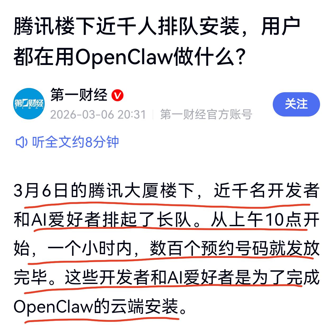 现在科技圈最火的就是 OpenClaw 了,算力基础设施设施会是最受益的那位。这款软件在GitHub上狂揽26万颗星,单周涌入200万访客,目前正以迅雷只是席卷我国科技圈,科技大厂忙着上线一键部署,用户排队安装的,商贩上门服务的,人们忙得不亦乐乎,暗中最高兴的可能还是大模型、智算中心和云服务商了。 OpenClaw 被认为是AI实际用化的里程碑事件,直接将AI从大模型聊天“对话框”变成了能干活的“数字打工人”。就是你养一只“小龙虾”(OpenClaw),他帮你做许多书面的工作,还能帮你去赚钱。黄仁勋直接喊话,这是我们这个时代最重要的软件发布,Linux花了30年到达的普及水平,它只用了3周。同时黄仁勋也点破了更深层的影响,那就是算力真空,AI向人类工作渗透,无论硬件部署多大,都将处于算力受限状态。 不过养这个小龙虾也是要成本的,智能体让Token消耗量激增千倍,OpenClaw就是token粉碎机,一次任务就消耗10万、百万的Token,而且其内置了心跳机制,每30分钟自动醒来检查消息,有国外开发者说,在没有太多产出的情况下,心跳机制每天就要消耗20美元。 你指望“小龙虾”给你做事赚钱,就的先付出相应的代价,AI越能干,需要的算力就越多,你付出的钱就越多。这钱给谁了,当然是给大模型、智算中心和云服务商了,原来AI应用落地不理性想,推理侧算力消耗起不来,服务器租不出去,现在“小龙虾”贪吃Token,算力就会不够了,所以智算中心等算力基础设施会成香饽饽。 持有相关筹码的,且涨且珍惜。