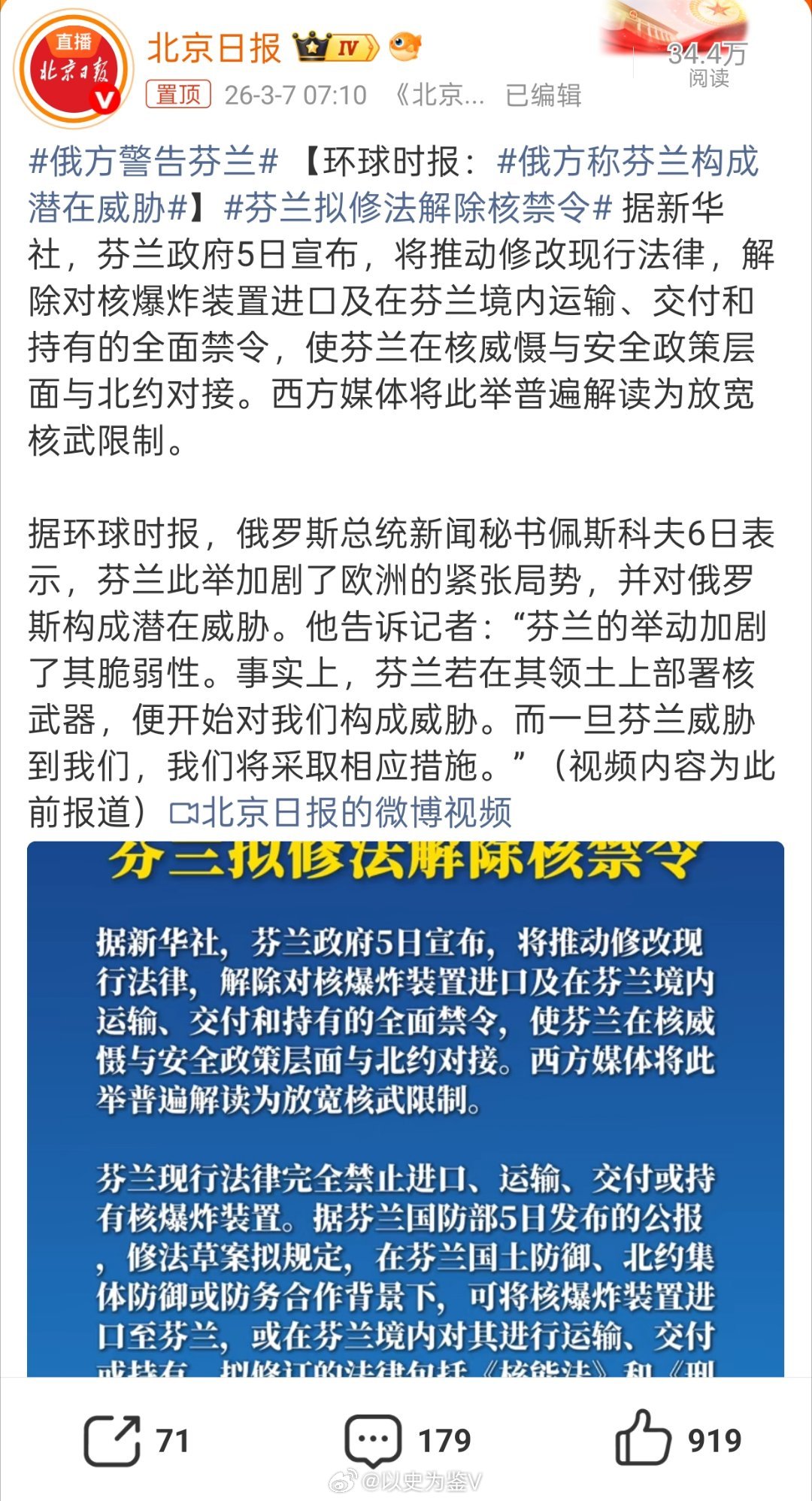 这个距离北约起飞一架飞机都能直接飞到莫斯科,现在芬兰又允许北约核武器进入,这对于俄罗斯来说是北约把枪抵到脑门上了。