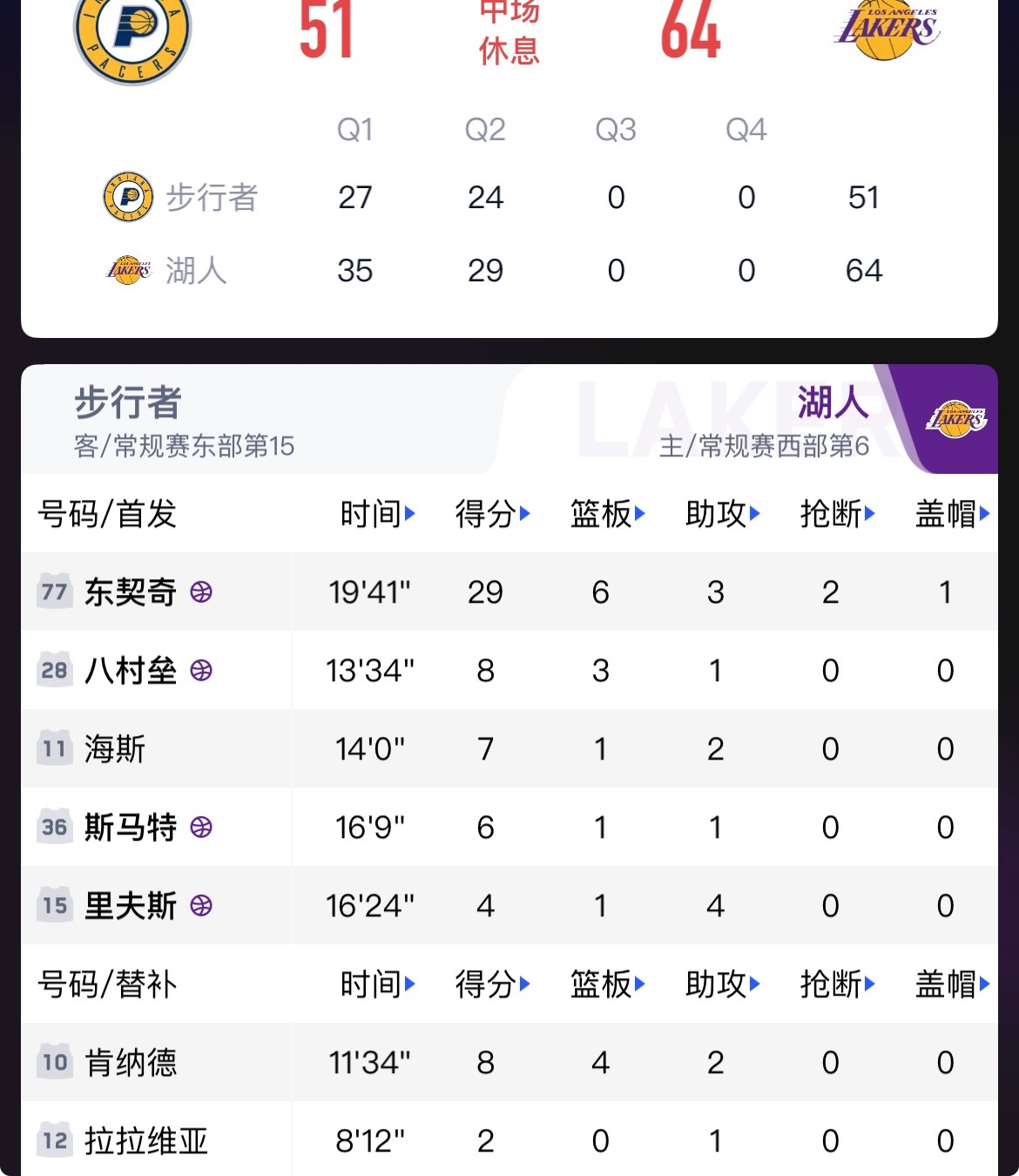 如果今天卢卡低使用率,比赛是不是就已经黄了。卢卡半场29分,其他球员没有一个上双NBA湖人vs步行者