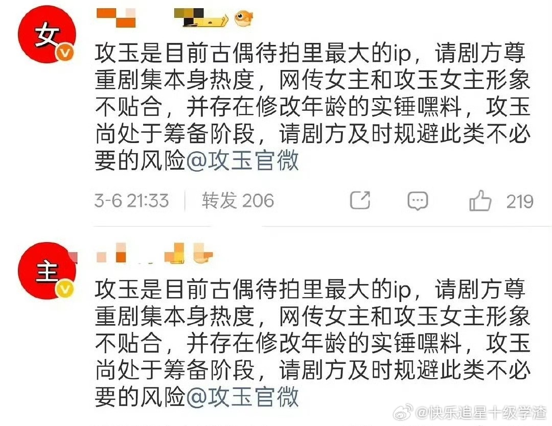 侯明昊粉丝给攻玉官博排字了拒绝网传二字女主