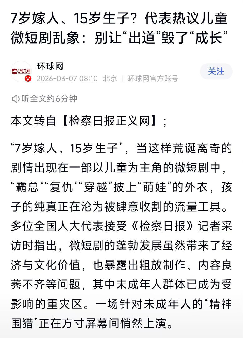100部微短剧中精品剧仅有不到2部现在微短剧越来越多,发展得很快,但真正好看、有质量的却很少。很多片子内容浮躁,只顾博眼球,很容易影响孩子的审美和价值观。希望行业能自我约束,多拍一些正向、优质的微短剧,给青少年带来好的引导和温暖。别让劣质微短剧毁了青少年三观