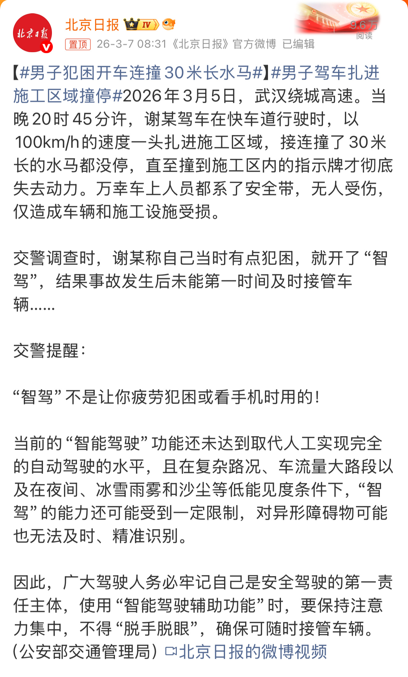使用逻辑也搞反了,越是犯困,越不能开智驾!你都犯困了,还怎么第一时间接管车辆?男子犯困开车连撞30米长水马男子驾车扎进施工区域撞停