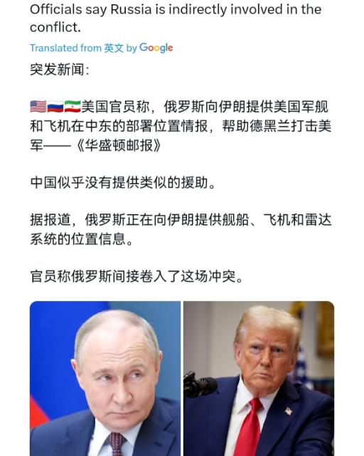 俄罗斯开始报仇雪恨了,现在该轮到美国难受了!3月6日,根据外媒报道,美国官员表示,俄罗斯正在向伊朗提供有关美国军舰和飞机在中东的位置的情报,帮助德黑兰瞄准美军,到目前为止中国似乎没有提供类似的援助。俄罗斯正在向伊朗提供舰船、飞机和雷达系统的位置,俄罗斯间接卷入了这场冲突。   俄罗斯好好的,为啥要帮伊朗对付美国?其实一点都不复杂,全是美国自己找的。这些年,美国没少针对俄罗斯,俄乌冲突爆发后,美国牵头搞了一堆制裁,又是冻结资产又是禁运,还天天给乌克兰递情报、送武器,就是想拖垮俄罗斯。俄罗斯一直记着这笔账,现在终于找到机会,给美国来个釜底抽薪。   而且俄罗斯帮伊朗,也不是白帮,算是互相帮忙、互相照应。之前俄乌冲突最激烈的时候,伊朗给俄罗斯提供了不少无人机,帮俄罗斯缓解了不少战场压力,解决了大问题。   现在伊朗跟美国闹得不可开交,美国联合以色列到处打压伊朗,俄罗斯反手帮一把,既是还人情,也是借伊朗的手,报复美国之前的打压,一举两得,算盘打得明明白白。   有人说,俄罗斯这是间接卷入了美伊冲突,这话没毛病,但也是美国逼出来的。美国总想着一家独大,到处煽风点火,只要不符合自己的利益,就打压这个、制裁那个,从来不管别人的感受。   以前俄罗斯没机会反击,现在抓住美伊冲突的机会,不用亲自下场,只需要递点情报,就能让美国难受,何乐而不为?   最有意思的是美国的反应,嘴上硬得不行,心里却慌得一批。美国防长之前还嘴硬,说俄罗斯在这场冲突里不算个事,结果转头就有官员爆料,俄罗斯在给伊朗递美军位置情报。   白宫发言人更是嘴硬,说这事儿无关紧要,还说正在彻底摧毁伊朗,可实际上呢?美军在中东已经有伤亡了,伊朗的导弹打得越来越准,要是真无关紧要,美国也不会这么急着出来表态,说白了就是打肿脸充胖子。   大家也能看出来,美国现在是真的难受。一边要在乌克兰盯着俄罗斯,投入了大量的资金和武器,迟迟看不到结果;一边又要在中东对付伊朗,现在俄罗斯还帮着伊朗,美军的位置被看得明明白白,不管是军舰还是飞机,只要敢在中东露面,就有可能被瞄准,美军士兵的安全都成了问题。   更让美国头疼的是,俄罗斯这么做,还能顺便推高国际油价。俄罗斯是能源出口大国,油价一涨,俄罗斯就能赚更多钱,既能缓解西方制裁带来的压力,还能有更多资金应对俄乌冲突,反观美国,油价上涨会让国内通胀更严重,老百姓怨声载道,拜登政府的支持率也会受影响,简直是赔了夫人又折兵。   可能有人会担心,俄罗斯这么做,会不会引发更大的冲突?其实不会,俄罗斯很聪明,只是提供情报,没有直接派兵参战,风险可控。而且俄罗斯也摸准了美国的底线,知道美国不敢轻易跟自己正面冲突,毕竟美国现在腹背受敌,根本没精力再开辟一个战场。   说来说去,这都是美国霸权主义自找的苦果。以前美国总想着欺负弱小、打压对手,以为自己天下无敌,现在终于遇到硬茬了。俄罗斯这波操作,既报了之前的仇,又牵制了美国,还帮了伊朗,可谓是一举三得。   反观中国,一直坚持中立立场,不选边、不站队,始终主张通过和平谈判解决冲突,这才是负责任大国该有的样子。不像美国,到处煽风点火、制造矛盾,最后搬起石头砸自己的脚。   现在的局势很明显,俄罗斯已经开始反击,美国的好日子到头了。以前是美国欺负别人,现在轮到美国难受了,这就是因果循环。   后续不管局势怎么发展,有一点可以肯定,美国的霸权地位,只会越来越不稳固,毕竟没有哪个国家愿意一直被美国欺压,越来越多的国家会联合起来,反抗美国的霸权。