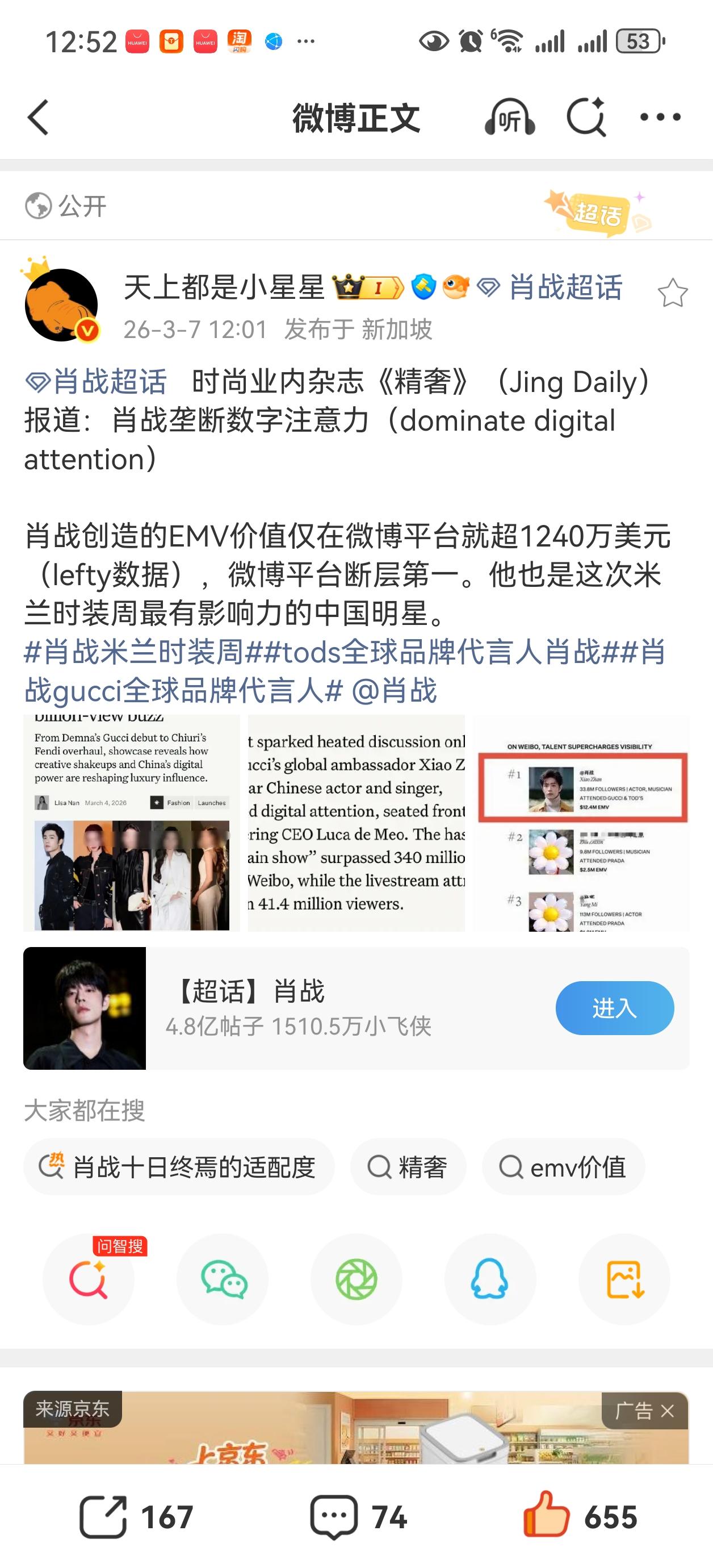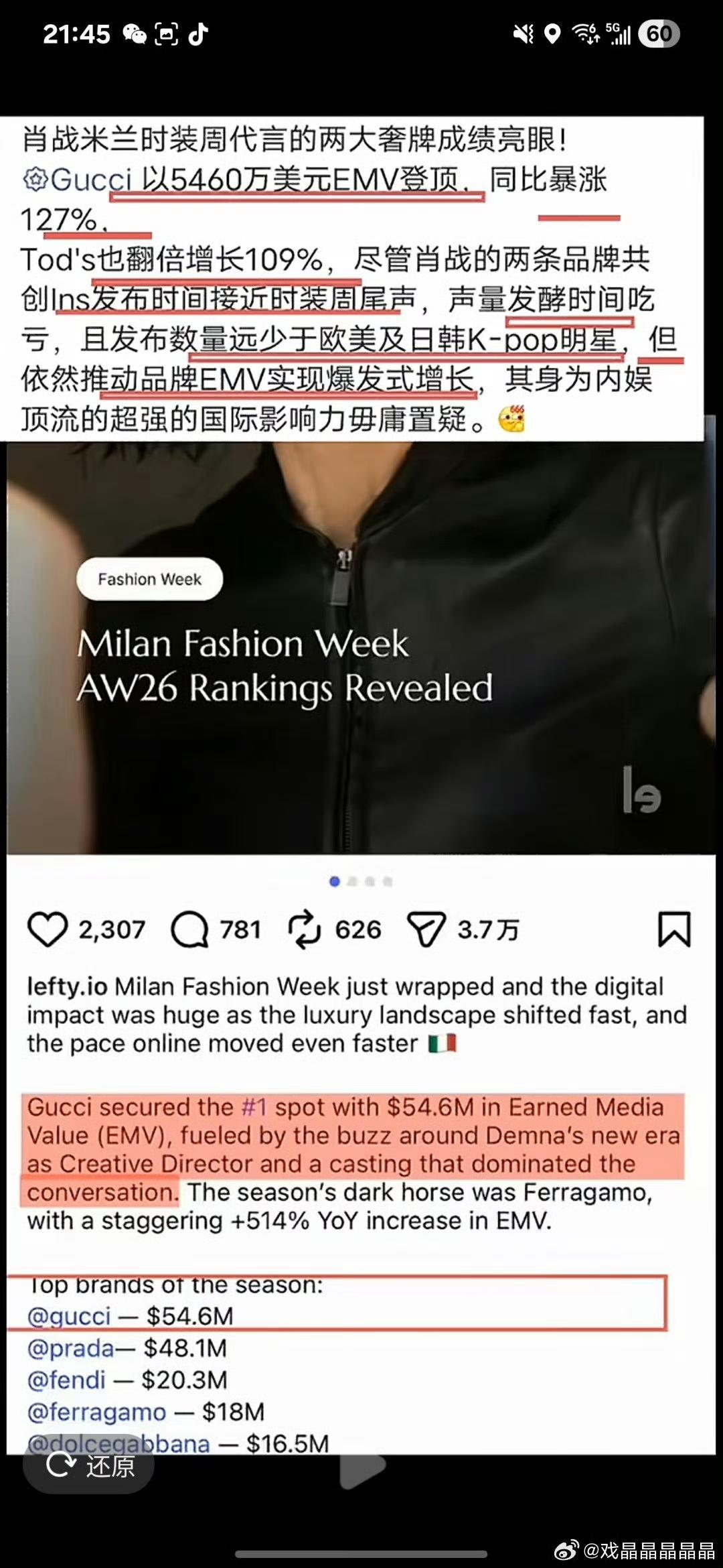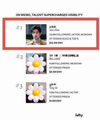 肖战创造的EMV价值仅在微博平台就超1240万美元(lefty数据),微博平台断层第一。他也是这次米兰时装周最有影响力的中国明星[比心][比心][比心]