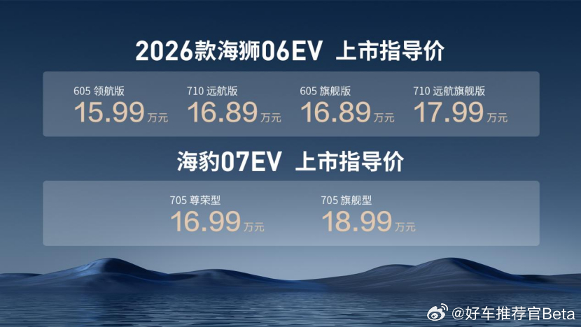 其中2026款海狮06EV正式上市,官方指导价格区间是15.99万元-17.99万元。按照续航里程对比,新一代车型有“可忽略不计”的涨价,不过叠加第一年免费充电(非运营的第二代刀片电池车型赠送免费1年充电权益),这笔买卖还是划算。