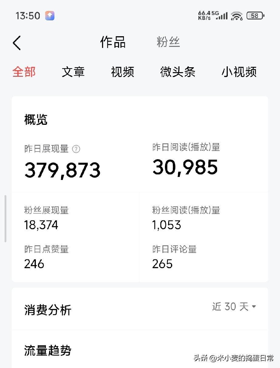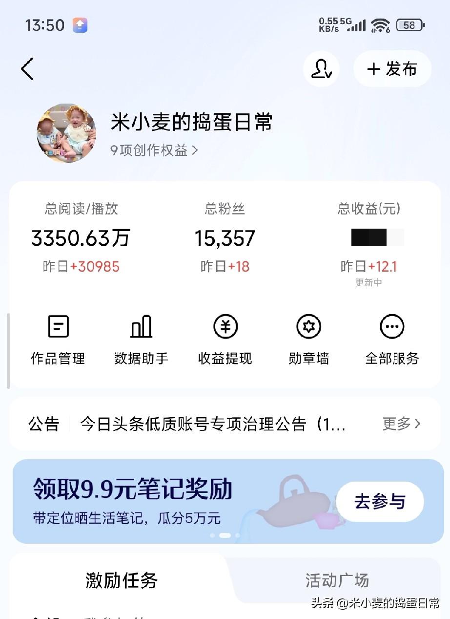 谁说微头条赚不到钱? 我用1.5万粉丝,在头条赚了很多买菜钱! 昨天后台又跳了12.1块,不多,也就够买半斤排骨。但看着总收益那串数字心里还是踏实的。 从去年抱着“试试玩”的心态发第一条微头条,到现在总播放破3350万,粉丝1.5万+,我最大的感受就是:别信那些“月入过万”的神话,也别信“做了也白做”的丧气话。 昨天38万的展现,3万多的播放,265条评论,有人骂我晒娃矫情,也有人说被我家娃的日常治愈了。我从不纠结数据,就当是记录生活,顺便赚点买菜钱。 有人问我秘诀,哪有什么秘诀?无非是每天坚持发,哪怕只有15个字+一张图;无非是说点真心话,不装不演。 别小看这几块钱,积少成多,至少我家的菜钱,是自己一笔一笔码出来的。 你在头条赚过钱吗?是够买菜,还是能买房?