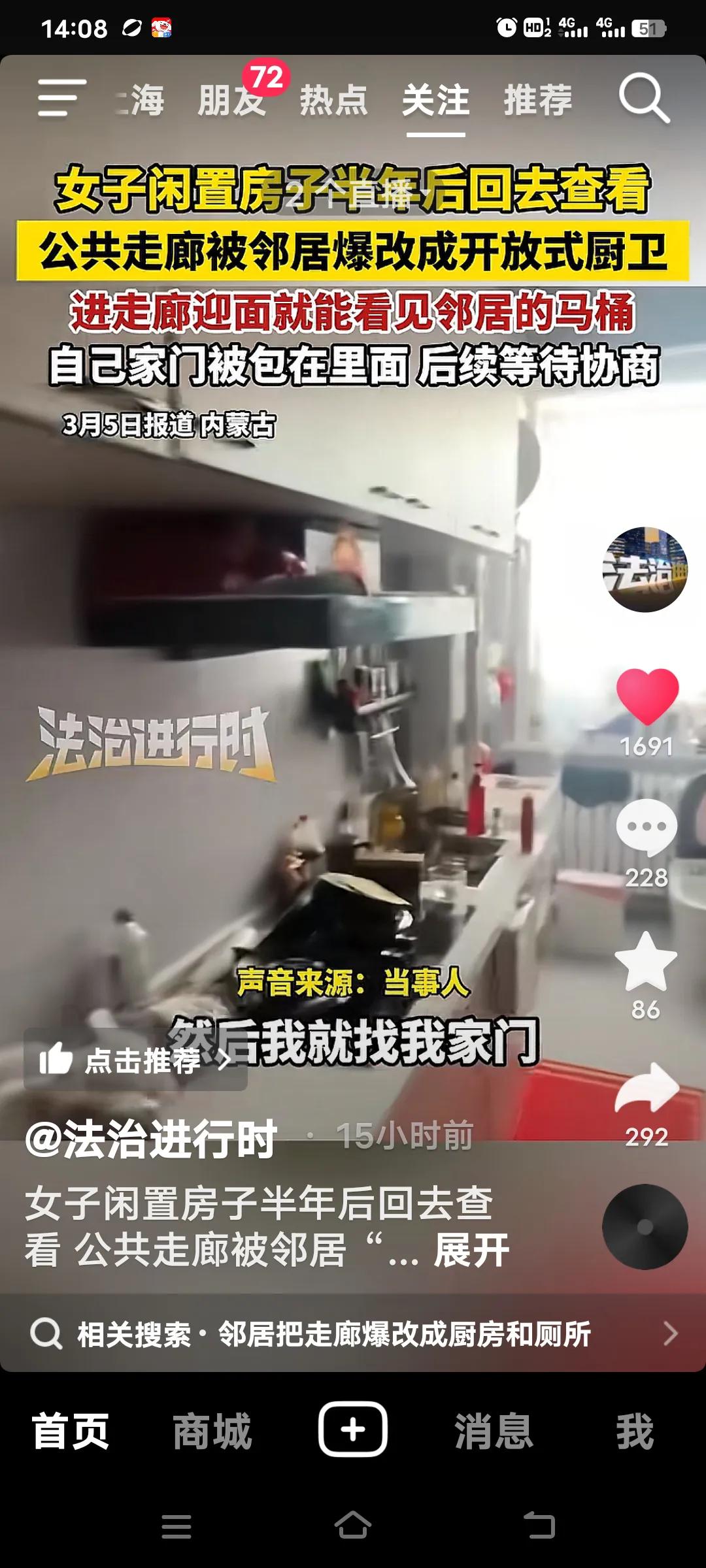 内蒙古有位女子半年后回到闲置房,直接惊掉了下巴!邻居竟把公共走廊改造成了开放式厨卫,燃气灶、洗手台、马桶应有尽有,她家门都被裹进了“违建”之中,回家还得穿过“厨卫”,都快找不到家门了,连门框都被包了进去。 这邻居素质实在太差了!哪怕人家一直不住人,也不能侵占公共走廊吧?买了房子就有使用权,不住也不意味着就得卖掉,难道还能把人家房子整个包围起来吗? 这种事并非个例。2025年,浙江温州有业主在电梯口堆放装修杂物;2024年,北京海淀筒子楼清出3吨杂物。公共走廊是大家共有的,也是“生命通道”,《消防法》明确规定不能占用、堵塞。而且依据《民法典》,邻居私自改造侵犯了其他业主的共有权。 这女子遇到这般糟心事,先联系邻居协商,希望能有个合理的解决办法,不然每天面对这尴尬场景,想想都憋屈得喘不过气。 改造储藏间 房屋走道设计