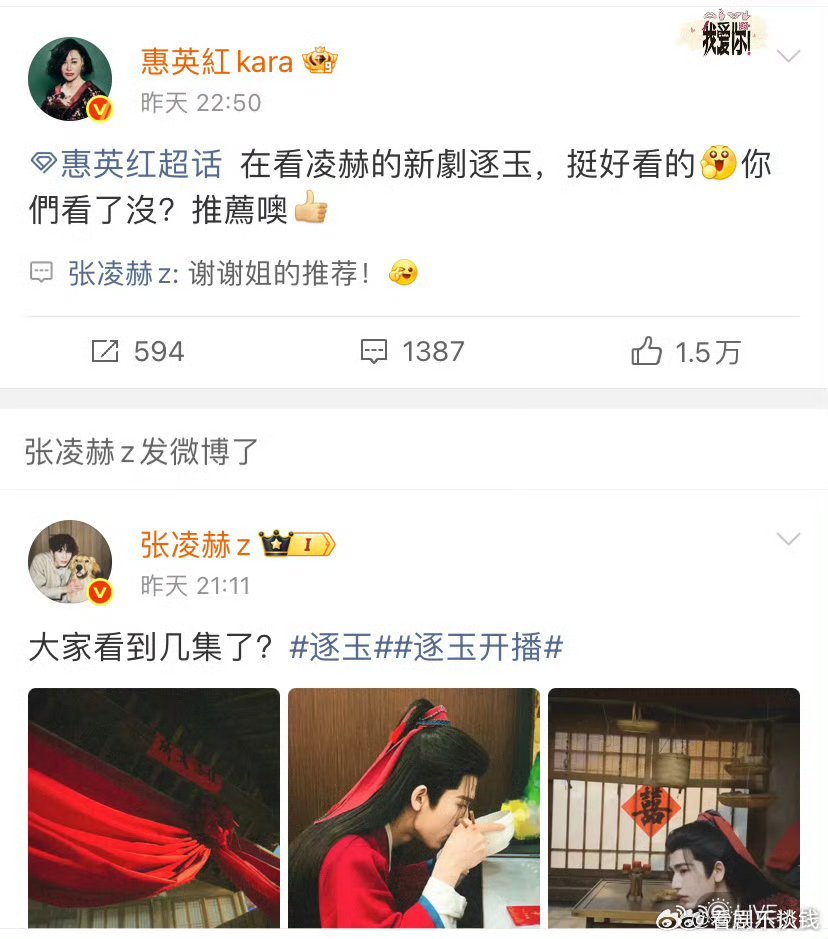张凌赫感谢惠英红推荐逐玉惠英红也在看《逐玉》。昨晚也是五集一口气看完了不够看啊