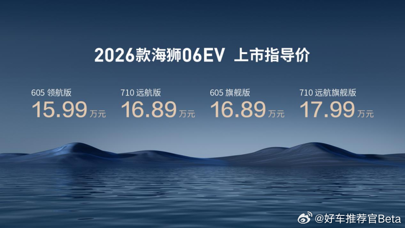 2026款海狮06EV价格调整,官方指导价15.99万元-17.99万元。