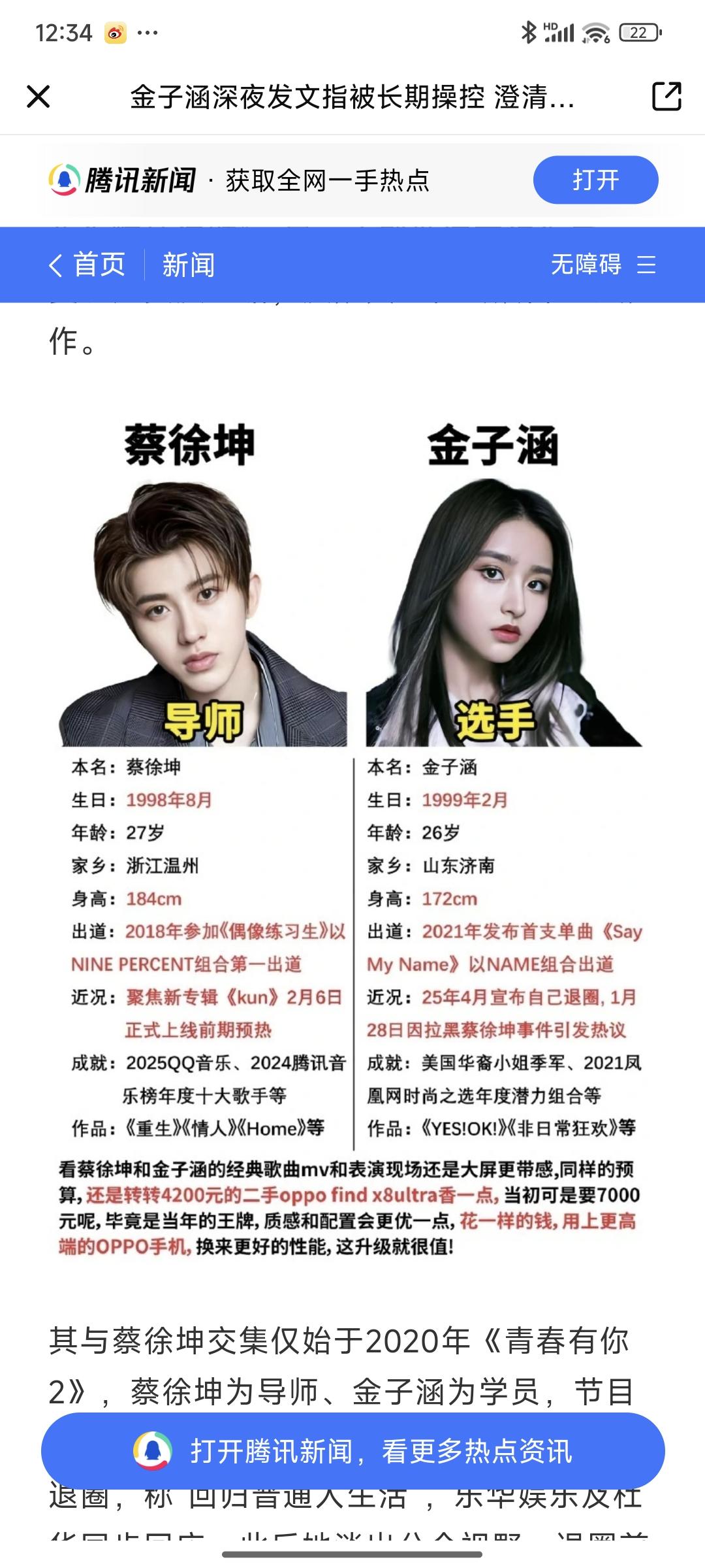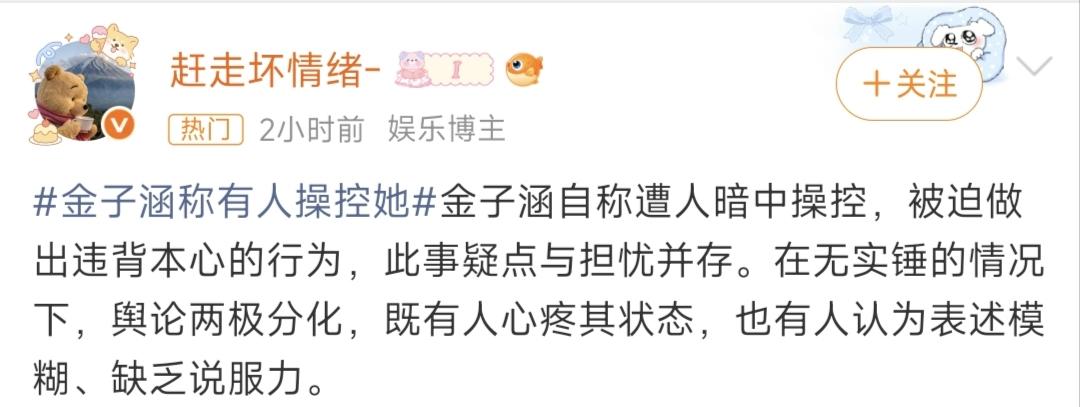 凌晨三点刷到金子涵的热搜,我整个人瞬间清醒,鸡皮疙瘩都起来了。 3月7号凌晨,绝大多数人还在睡梦里的时候,已经退圈快一年的金子涵,突然炸上了热搜。她发了一篇长文,没有团队预热,没有公关铺垫,只有几句看得人心里发紧的歌词:“Sending out a distress signal(发出求救信号)”“Get me out of this mess(帮我脱离困境)”。 别误会,这不是什么新歌宣传。 这根本就是一个走投无路的人,隔着屏幕在拼尽全力喊救命。 长文里,她先给之前闹得全网沸沸扬扬的“拉黑蔡徐坤”事件,做了个让人后背发凉的澄清。 今年1月,她突然晒出拉黑蔡徐坤账号的截图,配文阴阳怪气,还带了个竖中指的表情,当时直接把蔡徐坤推上了热搜,全网都在猜两人有什么私人恩怨。最后蔡徐坤工作室紧急回应,说两人只有节目录制的交集,顺带还宣传了新专辑。 结果现在金子涵说,当时那一切,全是被“暗处的人”操控、误导的,根本不是她本人的本意。 但比起这场乌龙,真正让人越想越怕的,是她后面的话——她声称自己长期被人暗中操控,一直被迫做一些违背本心、甚至违背道德的事。 更让人心里发毛的是,她的长文里还没头没尾提了一句王思聪持股的医美公司,没说清到底有什么关联,但网友很快就扒出来,2025年底爆雷的那家医美机构,王思聪正好持股50%。这话放在这,到底是什么意思?越琢磨越让人心里发慌。 比这些文字更揪心的,是她这一年多来,整个人肉眼可见的垮掉。 2025年4月,她突然宣布退圈,清空了所有社交账号,对外说要“回归普通人的生活”。可之后的她,剃了寸头,172cm的身高,暴瘦到只剩49公斤——这个身高配这个体重,已经到了严重营养不良的程度,整个人瘦到脱相。 被路人拍到的照片里,她手腕上有不明伤疤,眼神空洞涣散,完全没了当年站在舞台上的灵气,像被抽干了所有精气神。 之前有和她合作过的化妆师就说过,她以前录节目化妆,经常坐着坐着就突然掉眼泪,还会赶紧背过身去,硬撑着不让人看见。2023年录团综的时候,她就曾突发不适当场昏厥,之后就被迫退出了所有活动。 退圈前,就有人拍到她走在路上,瘦得像张纸片,风一吹就能倒;退圈后,她偶尔发的照片,配文写着“一切会越来越好”,可所有人都能看出她眼里的强颜欢笑。 从当年参加选秀被全网嘲“胖”,到现在退圈了还要被骂“瘦脱相”,这个女孩好像从始至终,都没被这个圈子放过。 这事一出,评论区直接吵翻了,完全分成了两派。 一边是真心心疼她的网友,说看着她从《青春有你2》一路走过来,当年卡位第11名惜败出道位,多少人替她意难平。后来加入女团NAME没火起来,一路高开低走,本来以为退圈是解脱,没想到是掉进了另一个坑。凌晨三点发这种内容,要不是真的走投无路,谁会这么做? 但另一边也有不少质疑的声音,说去年9月还有人在首尔偶遇她,当时状态看着很开朗,怎么才半年不到就变成了这样?而且她通篇说被操控,却没拿出任何实锤,表述模棱两可,很难不让人怀疑是炒作。 到现在为止,金子涵的家人、她的前经纪公司乐华娱乐,还有被牵扯进来的蔡徐坤方,都还没有任何回应。 我看到有网友说的一句话,真的特别戳人:一个已经退圈、没团队、没流量,连求救都要藏在英文歌词里的女孩,如果真的有别的办法,谁愿意把自己的狼狈和绝望,赤条条地摊在全网面前? 我们不知道她嘴里的“暗处的人”到底是谁,也不知道她到底经历了怎样的困境,更不知道她凌晨三点发出的求救信号,到底有没有人能接住。 只希望她能平安。如果真的身处困境,能有人实实在在地拉她一把。