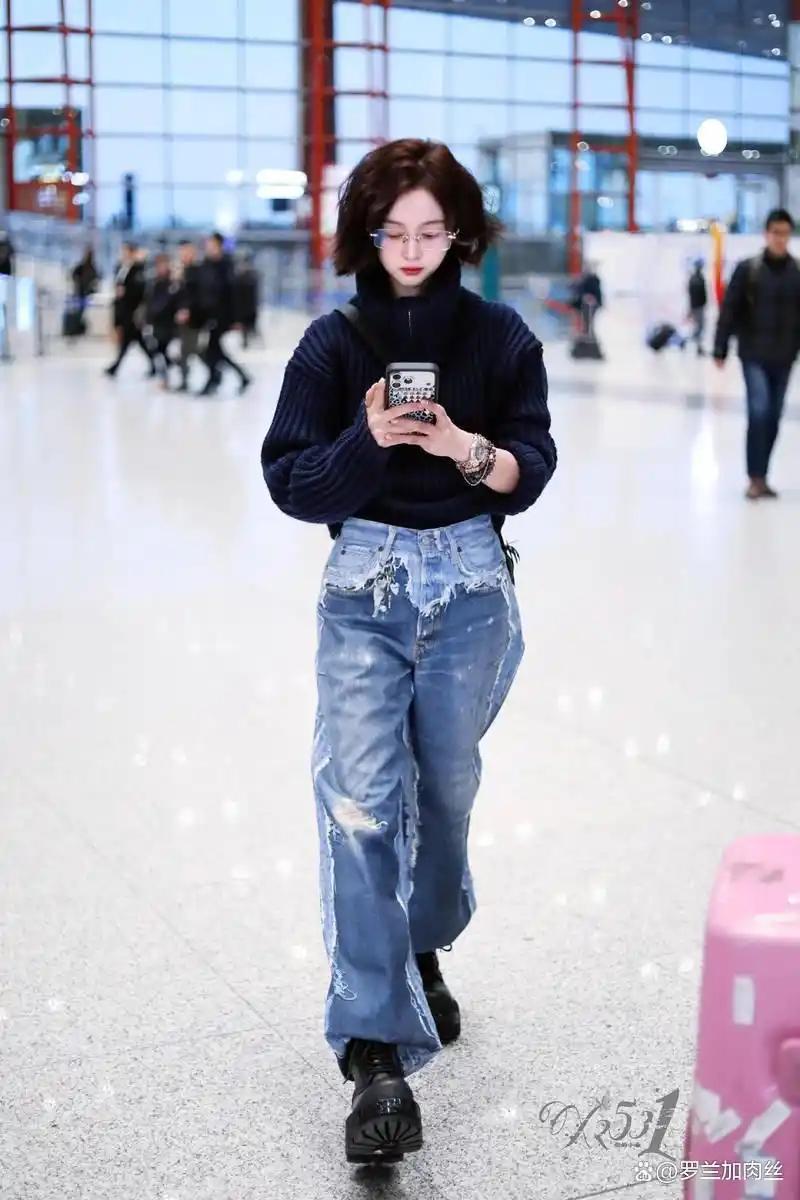 吴宣仪以全新短发造型亮相机场。她身穿一件简约的藏青色高领毛衣,搭配一条浅色破洞牛仔裤,整体装扮看起来随性自然却又不失酷飒风范。毛衣的高领设计为她增添了几分温暖感,与破洞牛仔裤的休闲风格相得益彰,显得格外有型。她低头专注地看着手机,脚步轻快,流露出一种不经意的时髦感,仿佛机场就是她的时尚秀场。