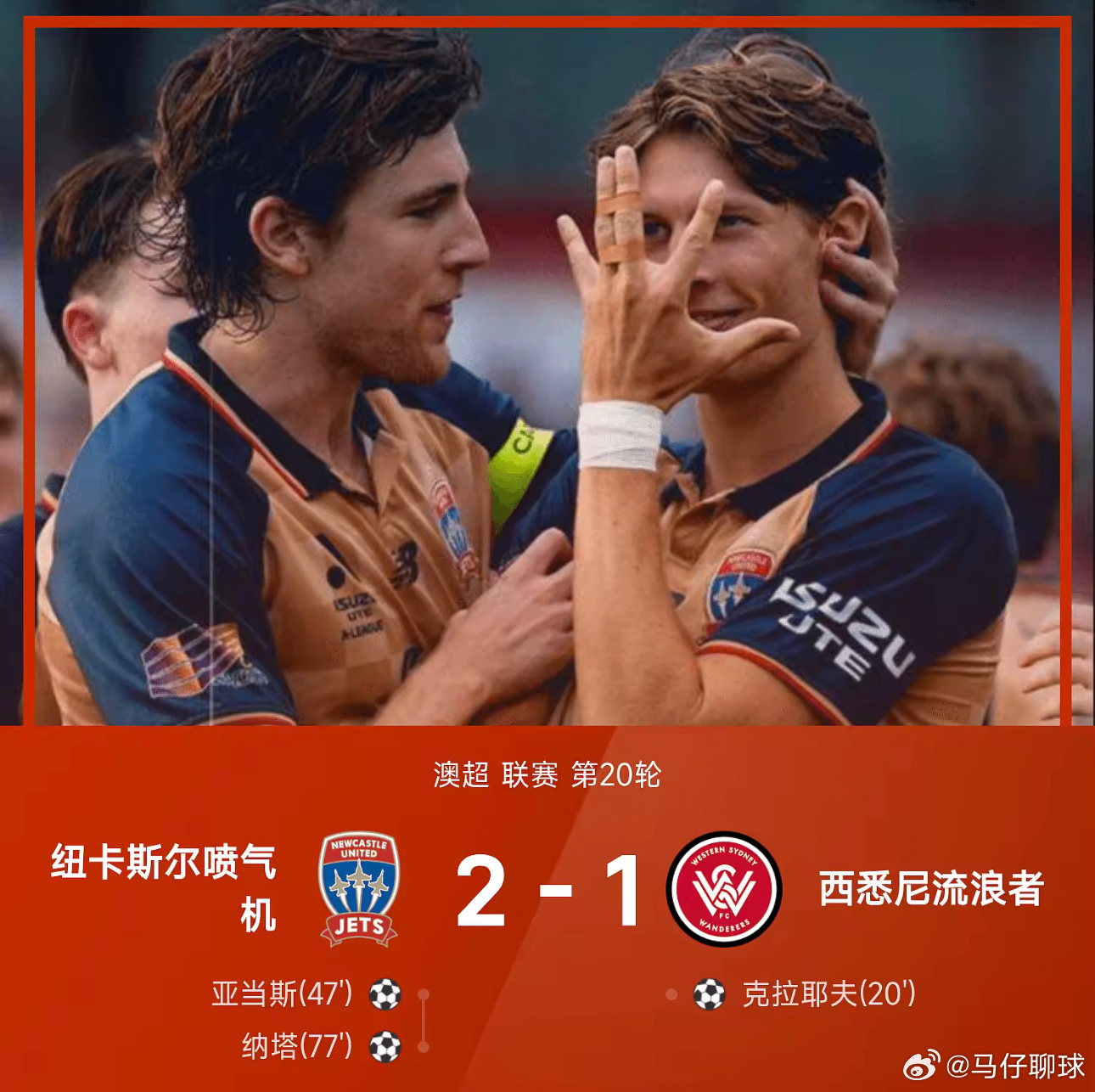 03月07日讯 25/26赛季澳超联赛第20轮,纽卡斯尔喷气机主场以2-1逆转西悉尼流浪者。上半时比赛,克拉耶夫助西悉尼取得领先;下半时比赛,亚当斯和纳塔联袂建功,助喷气机最终实现逆转。澳超