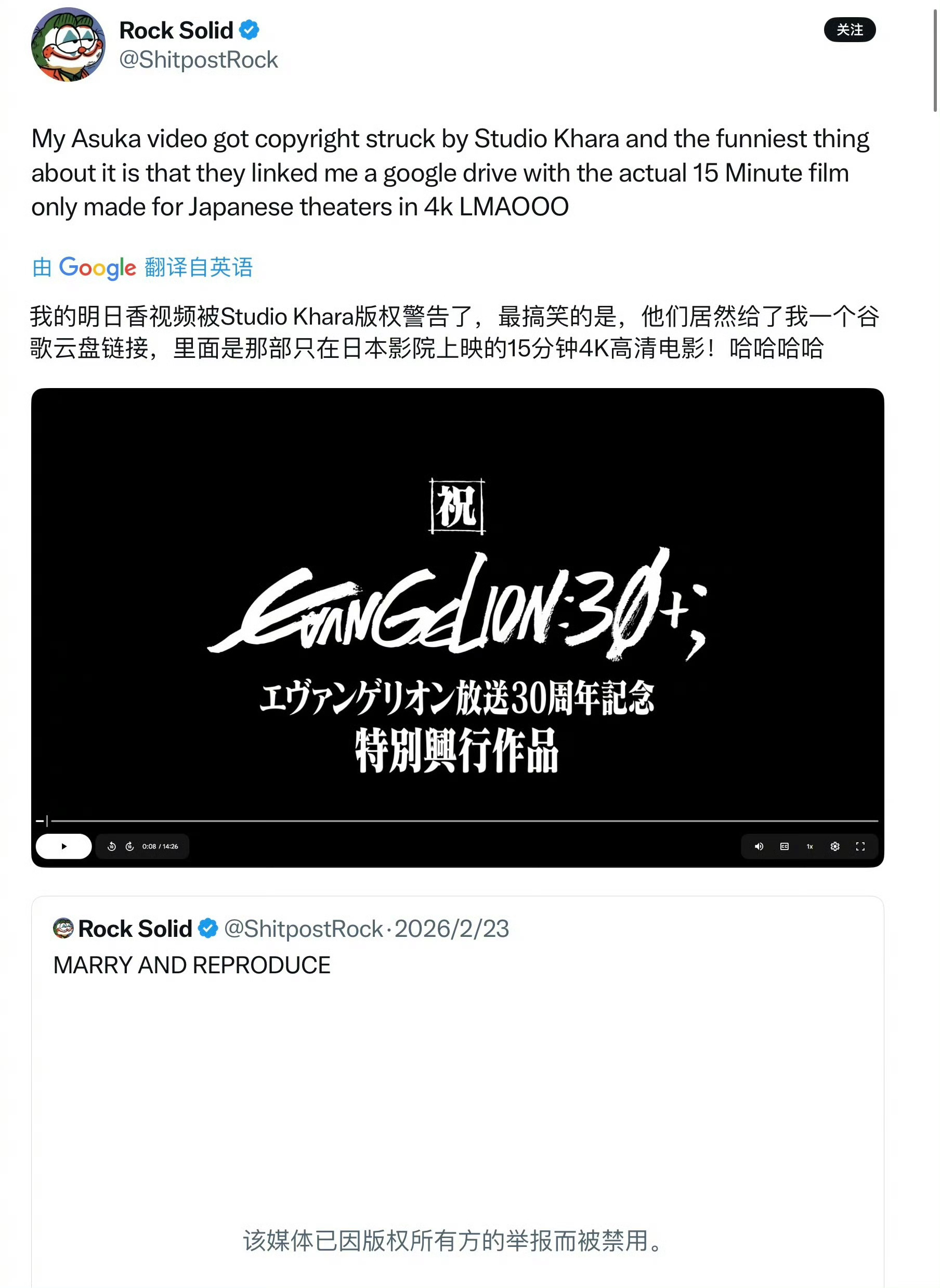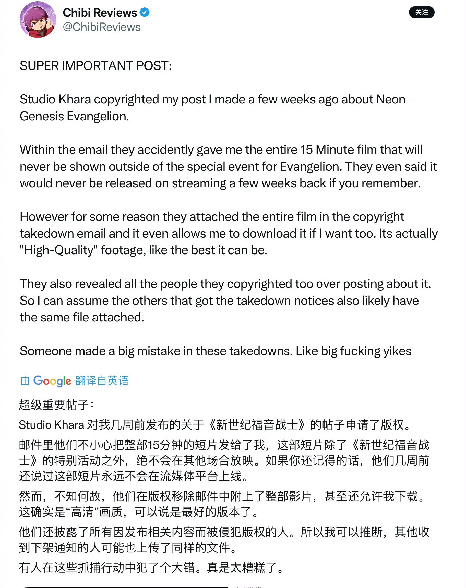 EVA片方泄漏高清片源 EVA制作公司khara在此前的30周年纪念短片偷拍片源泄漏风波中,不慎将4k高清版全片片源,随着版权警告的邮件,一起发给了偷跑短片的博主