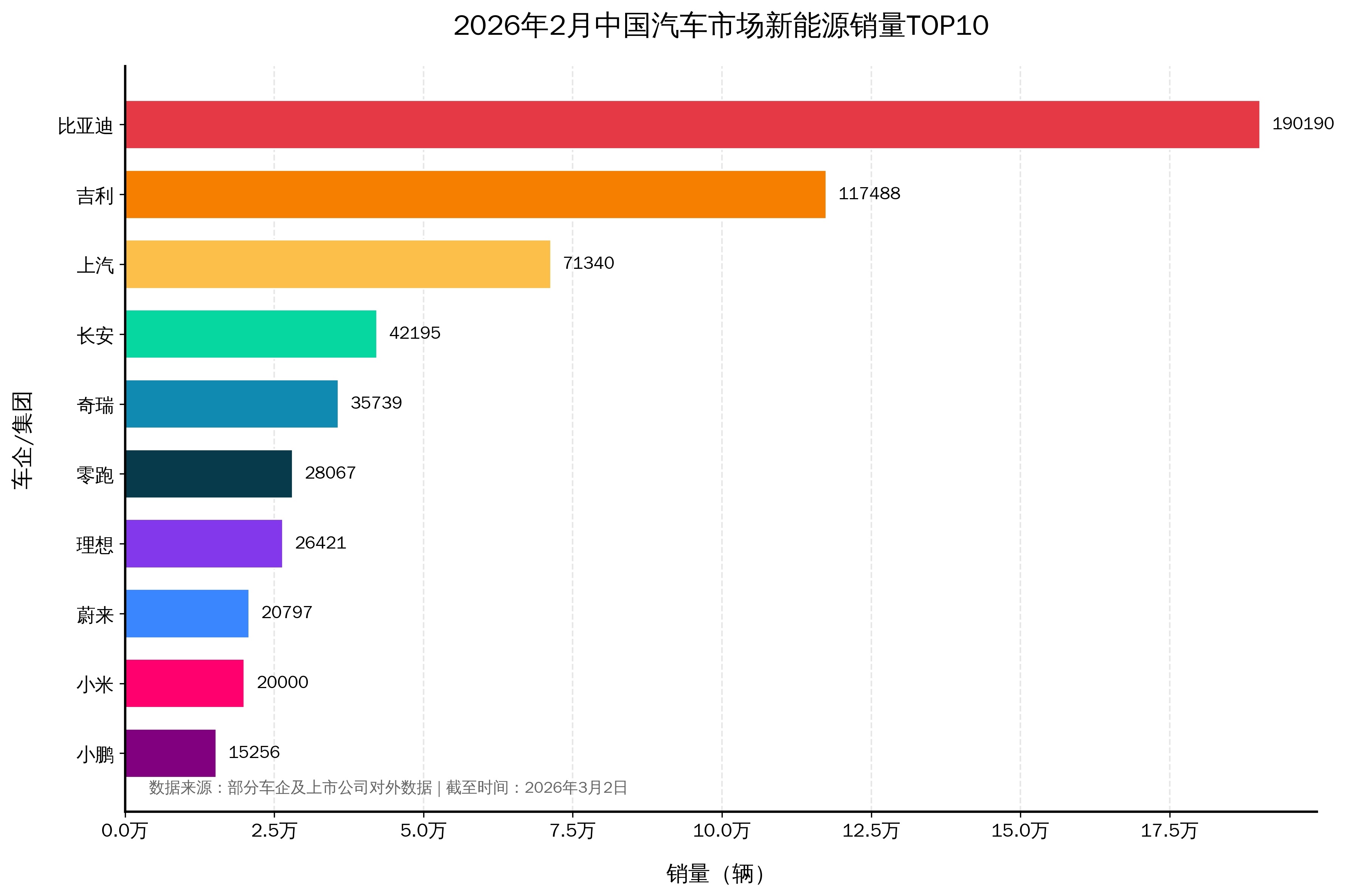 2026年2月新能源汽车销量榜单出炉,比亚迪以190190辆的成绩再度拿下销冠,坐稳行业头把交椅,这也是其自2021年6月以来连续57个月蝉联新能源销量榜首,头部优势依旧显著。