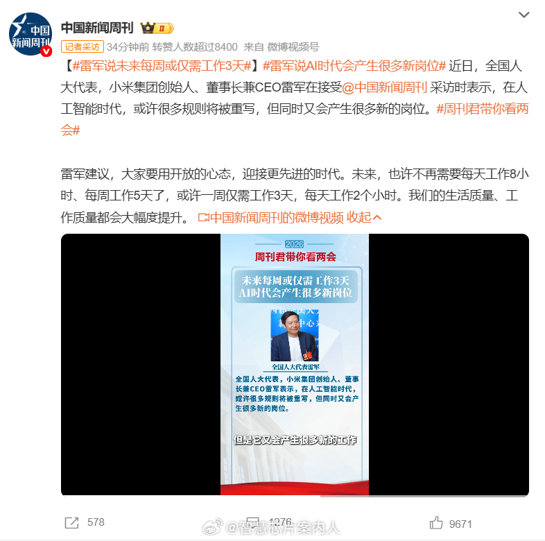 雷军说未来每周或仅需工作3天