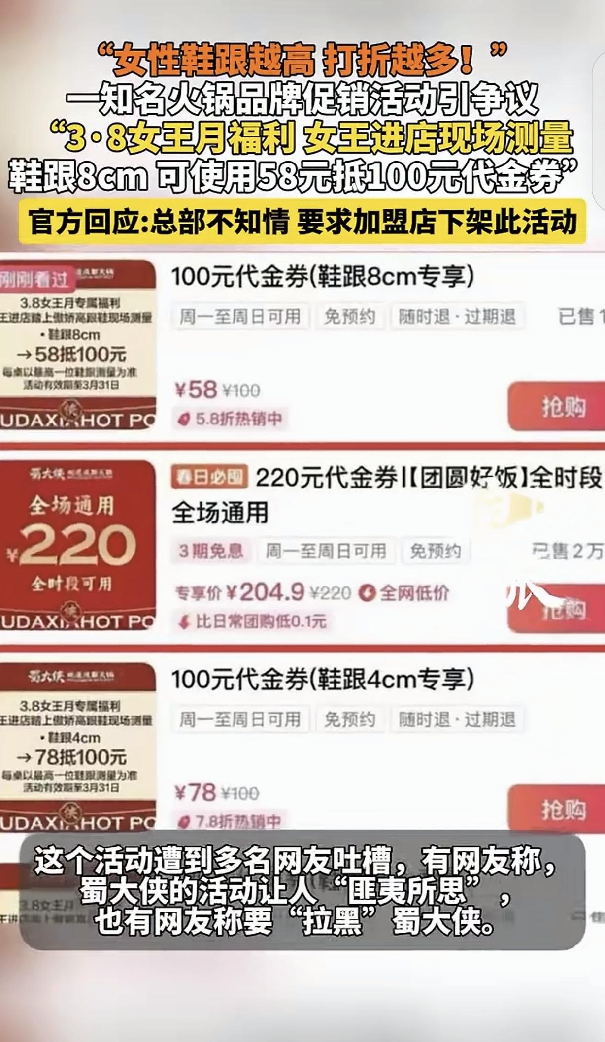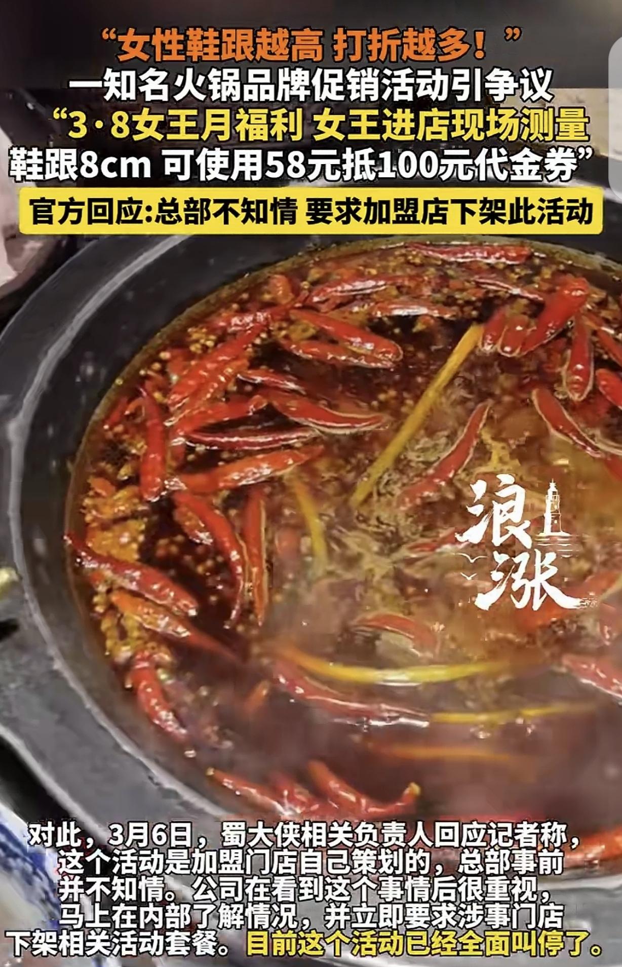 “3.8节又出幺蛾子!”一男子开火锅店,他一看妇女节快到了,就琢磨出一个噱头,宣传只要来消费的女性,进门就量鞋跟,鞋跟高8cm,可用58元抵100元代金券,鞋跟高6cm,可用68元抵100元,鞋跟高4cm,78元抵100元,鞋跟高2cm,可用88元抵100元,鞋跟越高,抵的金额越高,这哪里是尊重女性?简直是戏耍女性!总部回应:这个活动是加盟店自己策划的,我们不知情,已经下架此活动。 一男子加盟了某品牌的火锅店,眼瞅着三八妇女节快到了,别的商家都在想着怎么真诚地给女性顾客送福利、表心意。 他倒好,满脑子琢磨着怎么搞个吸引眼球的噱头来招揽生意。 也不知道他这脑袋瓜是怎么转的,居然想出了个按女性鞋跟高度,来给优惠的奇葩主意。 他大张旗鼓地宣传:只要来店里消费的女性,进门就得量鞋跟。 要是鞋跟高8厘米,就能用58元抵100元的代金券;鞋跟高6厘米,68元抵100元;鞋跟高4厘米,78元抵100元;鞋跟高2厘米,88元抵100元。 简单来说,就是鞋跟越高,能抵的金额就越高。 这宣传一出去,立马就引起了轩然大波。很多女性看到这个活动,心里那叫一个不是滋味。 妇女节本来是倡导平等、尊重女性的节日,可这家火锅店倒好,把女性的价值跟鞋跟高度挂上了钩,这不是明摆着物化女性吗? 好像女性的魅力就体现在鞋跟有多高,鞋跟越高就越能得到实惠,这不是戏耍女性是什么? 有些女性原本还打算妇女节那天去这家火锅店尝尝鲜,看到这个活动后,直接打消了念头。 她们觉得这样的活动就是对女性的不尊重,根本不想给这种商家捧场。 还有人在网上吐槽,说这活动简直是对妇女节的亵渎,把一个好好的节日搞得乌烟瘴气。 随着舆论的发酵,这事儿越闹越大。火锅店总部也坐不住了,赶紧出来回应。 总部表示,这个活动是加盟店自己策划的,他们事先根本不知情。看到事情闹成这样,总部果断要求加盟店下架此活动。 这家火锅店原本想靠这个噱头在妇女节期间大赚一笔,没想到却弄巧成拙,不仅没招揽到多少顾客,还惹了一身骂。 这也给其他商家提了个醒,搞促销活动得动动脑筋,别净想些歪点子。 尊重女性、真诚对待顾客才是长久之道,要是为了博眼球而做出一些不恰当的举动,最后只会搬起石头砸自己的脚。 三八妇女节本是向女性表达尊重与关爱的日子,可这家火锅店却整出按女性鞋跟高度给优惠的噱头,实在是让人大跌眼镜。 这种做法看似新奇,实则是对女性的不尊重与物化。 它将女性的价值简单粗暴地与鞋跟高度挂钩,仿佛鞋跟越高,女性就越有“价值”,越能享受优惠,这是对女性独立人格的忽视。 商家搞促销活动本无可厚非,但得讲究方式方法,不能为了博眼球就毫无底线。 这种不恰当的营销手段,不仅伤害了女性的感情,也损害了自身的品牌形象。 在如今这个注重平等与尊重的社 会,消费者对于商家的行为有着更高的道德要求。 一旦商家的行为违背了公序良俗,必然会遭到消费者的抵制。 其他商家应该从这件事中吸取教训,在策划活动时,要多站在消费者的角度思考问题,尊重每一位顾客,尤其是女性顾客。 只有真诚地对待消费者,提供优质的产品和服务,才能赢得消费者的信任和支持,实现长久的经营和发展。 《消费者权益保护法》第14条规定,消费者在购买、使用商品和接受服务时,享有人格尊严、民族风俗习惯得到尊重的权利。 该火锅店将女性价值与鞋跟高度关联的活动,贬低了女性人格尊严,侵犯了消费者此项权利,商家应停止侵害、赔礼道歉。 对此,你怎么看?