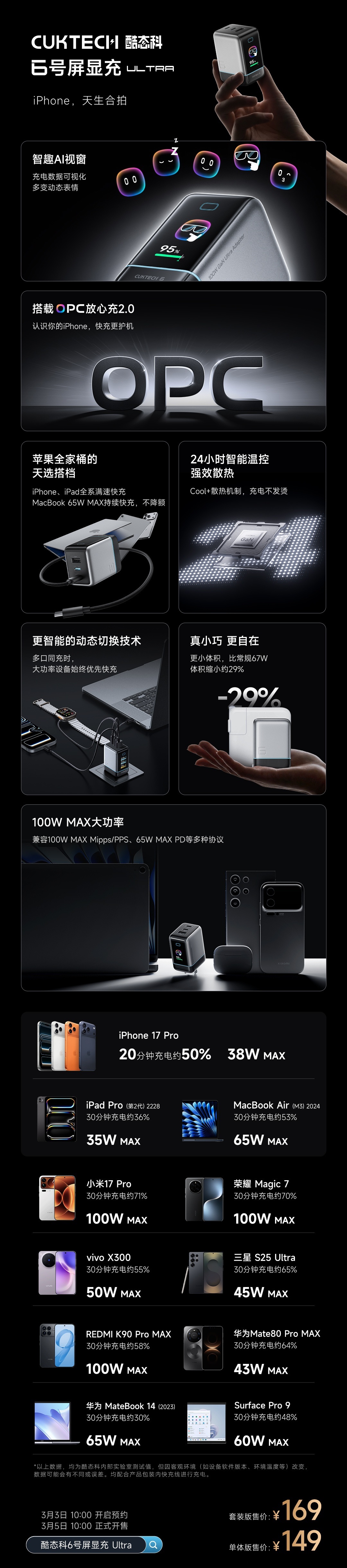 - 对苹果用户极其友好。其一,自研OPC放心充2.0能精确识别iPhone 15~17,通过控制充电功率来平衡充电温度与充电速度,延缓电池健康衰减(非常多苹果用户在意这个)。其二,比起市面上其他适配苹果手机的屏显充电器,6号Ultra支持给 Macbook 以 65W MAX持久输出。一个充电头就能满足“苹果全家桶”充电需求。