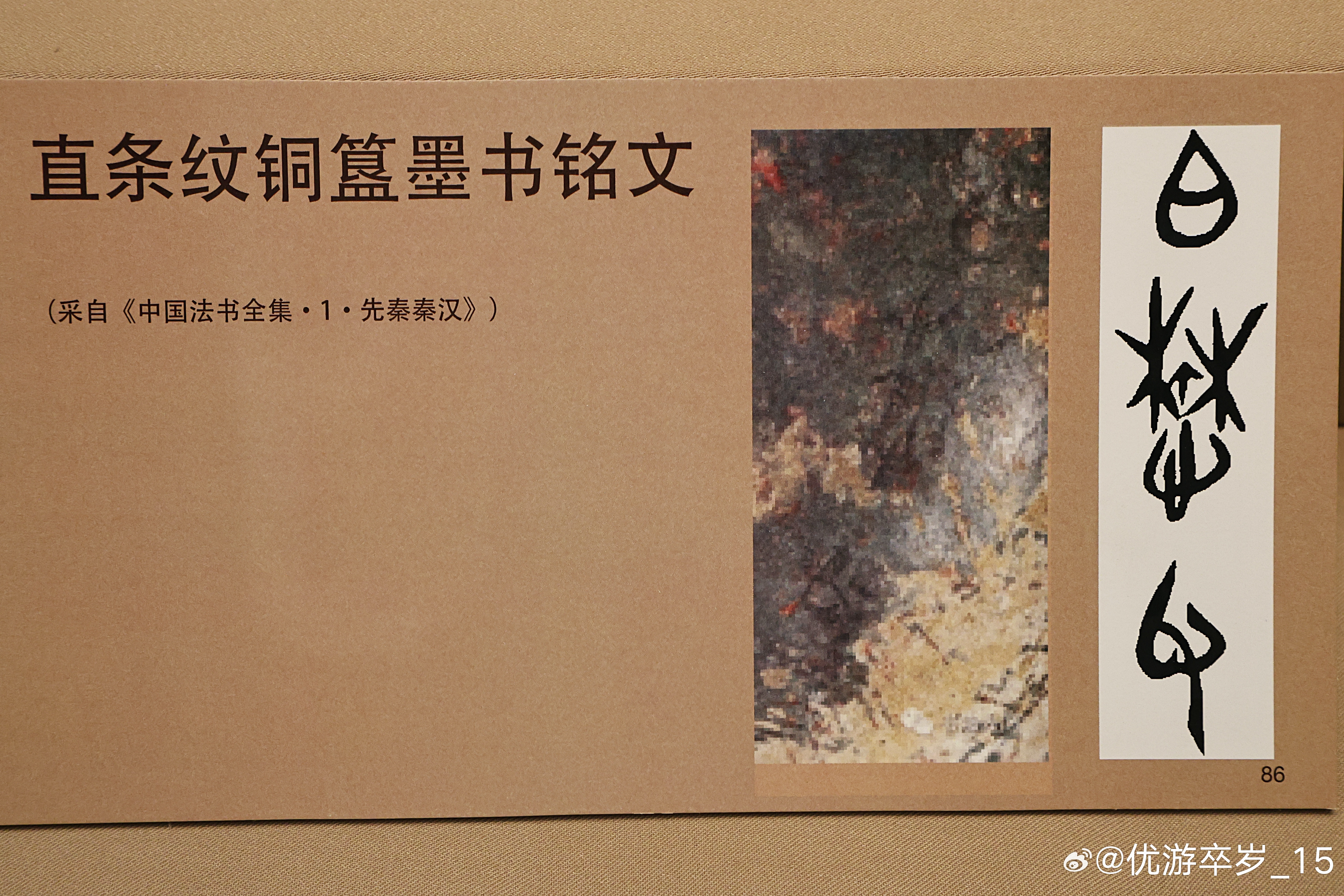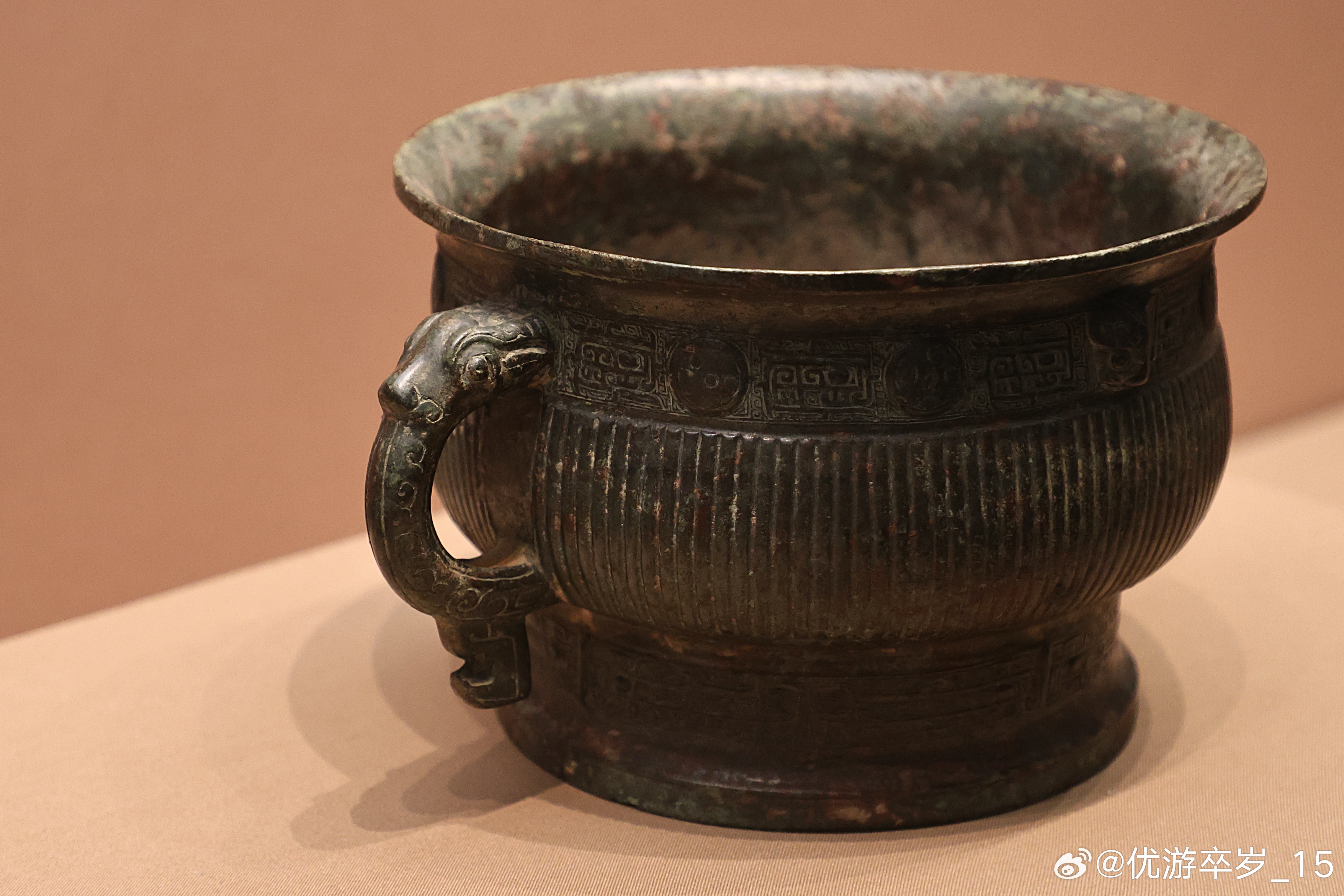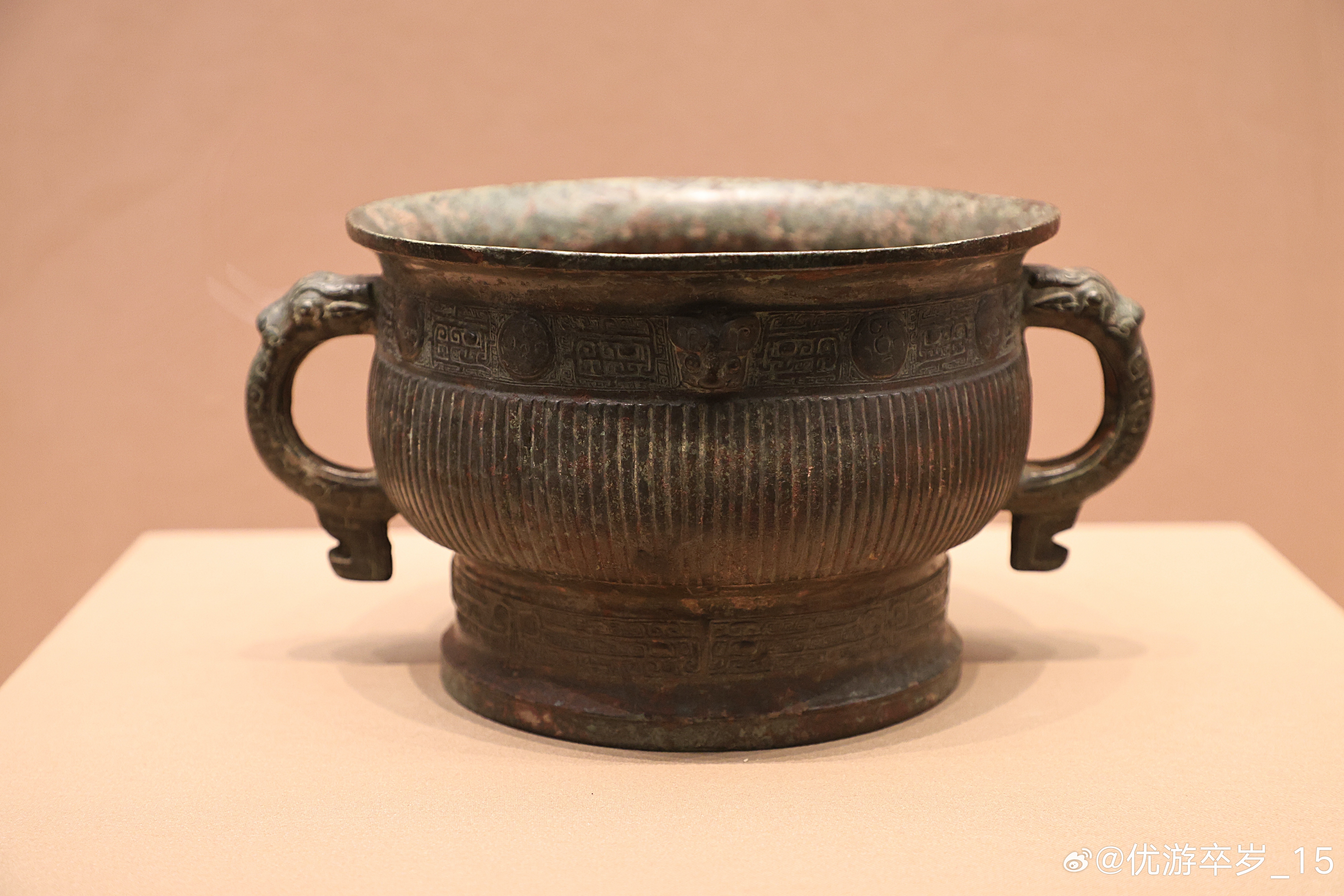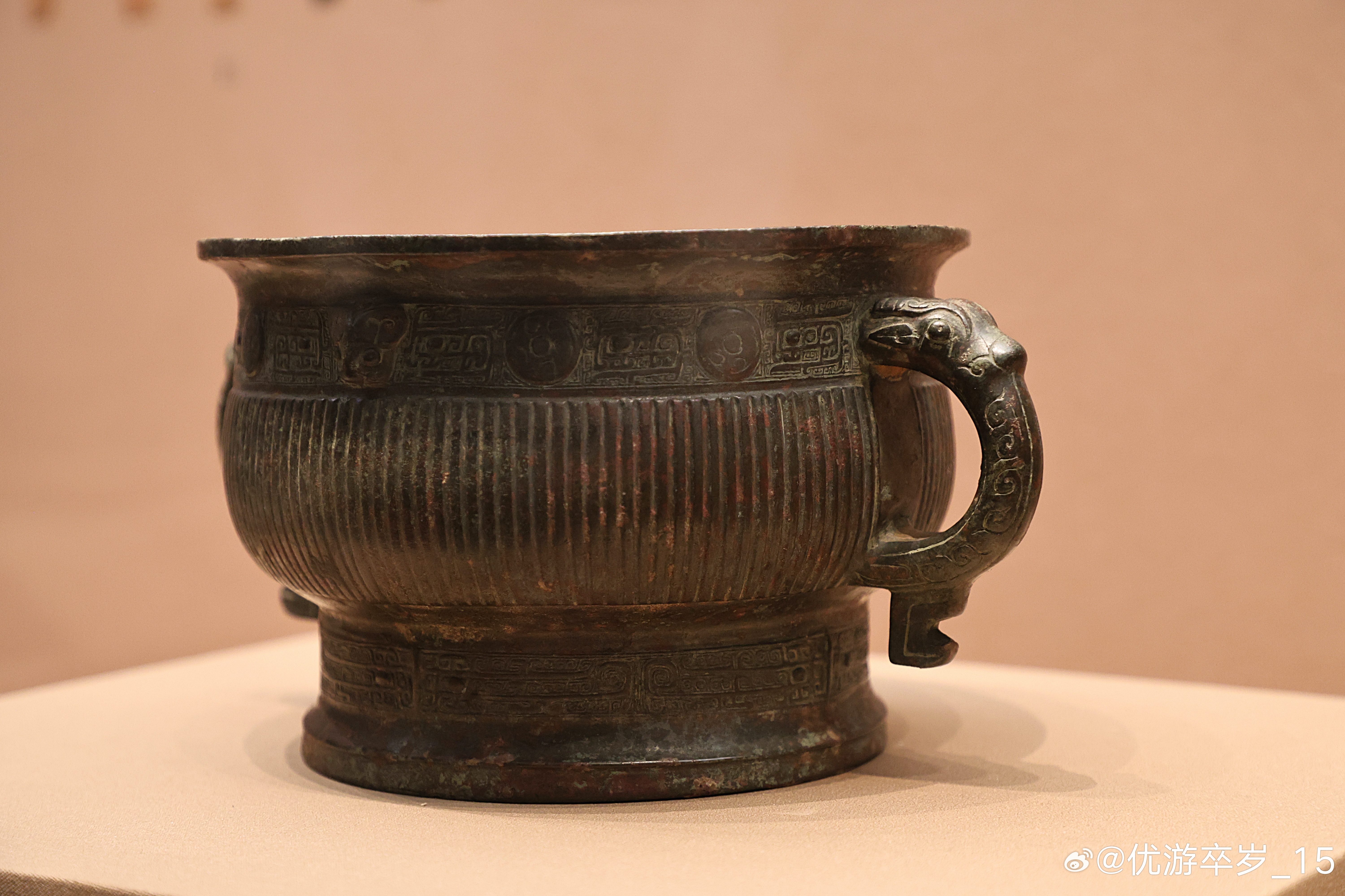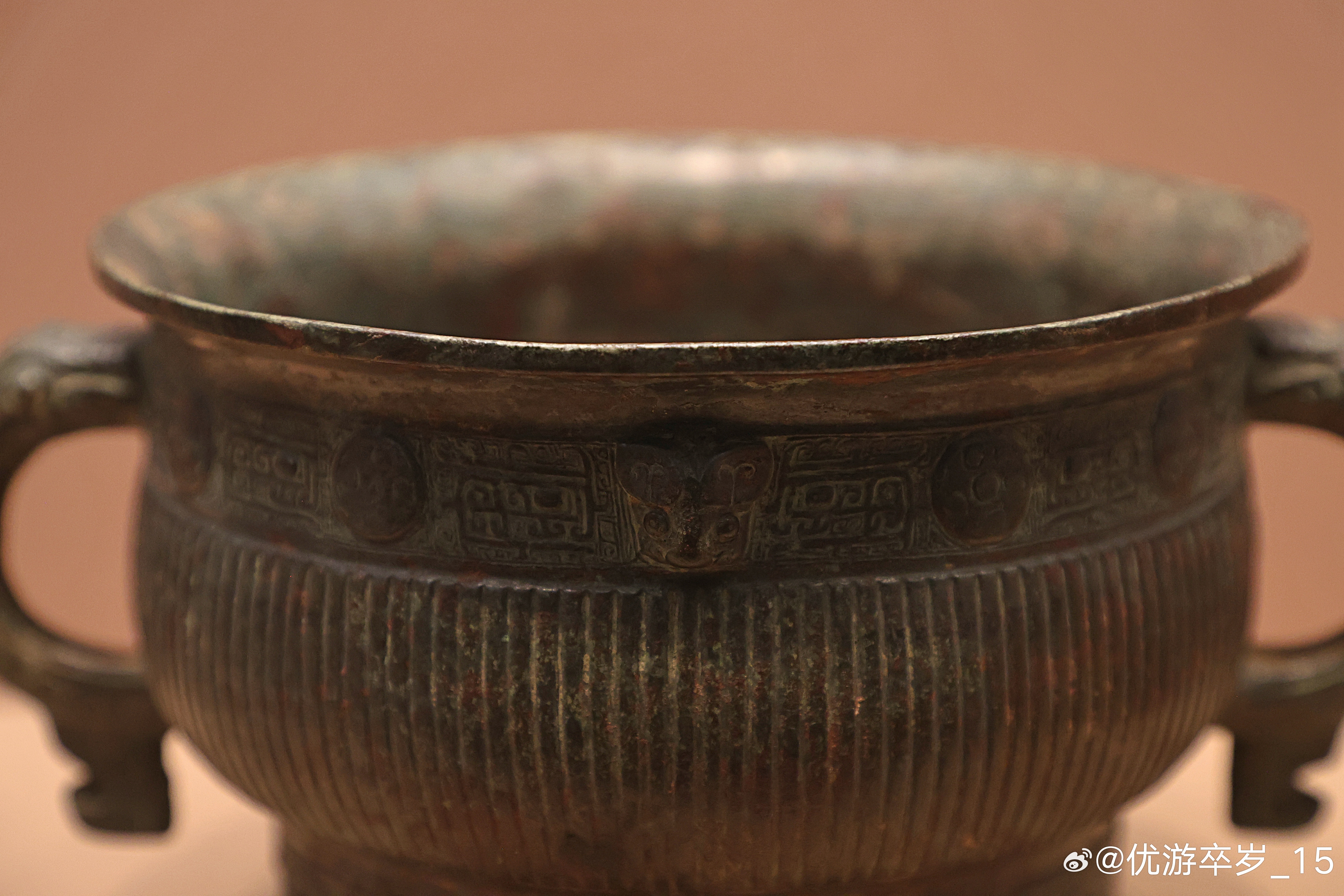 我的2026 【中国之中-中原古代文明精粹】直条纹铜簋西周(公元前1046-前771年)洛阳博物馆藏北窑西周墓地出土。此簋最重要之处在于器底的三字墨书痕迹:“白懋父”。“白”通“伯”,指爵位。“懋父”是私名。在青铜器上铭文多为铸就或刻就,墨书遗存,实属罕见,是早期中国软笔书写传统存在的实物证据。清华大学艺术博物馆展出2026.2.8约会博物馆文物
