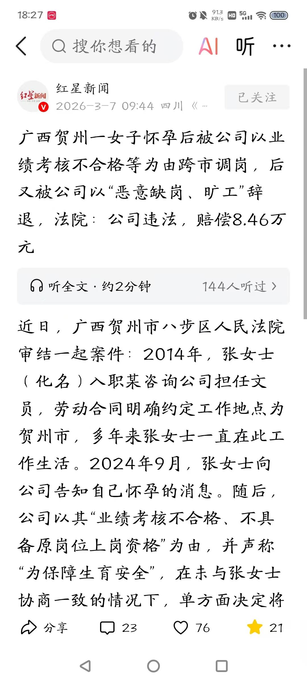 广西贺州,女子怀孕之后,第一时间将消息告诉了公司,本想着自己兢兢业业干了10年,没有功劳也有苦劳,公司好歹也会有点人情味。谁知,她高估了人性,公司以业绩考核不合格等为,将她调到了其他市。自己大着肚子去外地,实在不方便,没有去就在原岗位继续打卡上班,没想到,公司竟说她恶意缺岗、旷工,将她辞退。女子心寒又气愤,闹上法庭。 一位在公司勤勤恳恳干了十年的老员工,怎么也没想到,自己会因为怀孕,被公司用这样的方式扫地出门。 2014年,张女士通过层层选拔,入职了一家咨询公司,一直做文员。 十年来,她在贺州成了家,工作上也是兢兢业业,从没出过什么大差错,她和公司的劳动合同里,白纸黑字写得清清楚楚,工作地点就在贺州。 直到2024年9月,张女士发现自己怀孕了,出于对公司的信任,她第一时间把这个消息告诉了公司。 其实她心里清楚,怀孕女性在职场上压力有多大,但想着自己好歹是干了10年的老员工,公司多少会有点人情味,而且法律也保护孕妇,自己能像以前一样正常工作。 可没想到,消息刚说出去没多久,公司的态度就变了。 领导就找她谈话,说她业绩考核不合格,不具备原岗位的资格,为了“保障她的生育安全”,要给她换个好地方,把她调到几百公里外的另一个城市去。 那边给提供住宿、有伙食补贴,还报销一趟往返车票。 听着像是“优待”,可张女士心里却凉了半截,她在这儿生活了十年,老公、家人、朋友都在贺州,产检的医院都联系好了。 被调到几百公里外,意味着孕期最难熬的这段时间,她要一个人孤零零地到陌生城市去,没人照顾,生孩子的时候家人也不在身边。 她跟公司明确表态,自己不想去,这太不方便了。 可公司根本不听她的,调岗通知就这么硬生生地下发了,更让她心寒的是,那段时间连工资都开始发得不及时了。 张女士实在没办法,她觉得自己没做错什么,不能就这么走了,所以,她还是选择每天像往常一样,到贺州的公司办公室去上班,打卡签到。 她想着,只要我人在岗位上,你总不能再挑我的理吧? 可她想错了,公司不仅不给她安排工作,没过多久,一纸《解除劳动合同通知书》就拍到了她面前。 理由写得很难听,说她恶意缺岗、旷工,不服从管理,严重违反公司制度。 拿着那张通知书,张女士手都在发抖,十年,最好的青春都耗在这儿了,就因为怀了孕,公司就要变着法儿地把她赶走,最后还给她扣上个“旷工”的帽子。 这口气,她怎么也咽不下去。 既然公司不讲情面,那她就要用法律给自己讨个说法,直接去申请了劳动仲裁,要求公司支付违法解除劳动合同的赔偿金及欠付工资。 谁知,仲裁结果并没有保护张女士的合法权益,无奈之下,她向法院提起诉讼。 《劳动合同法》第四十二条规定:女职工在孕期、产期、哺乳期的,用人单位不得依照本法第四十条、第四十一条的规定解除劳动合同。 法院审理查明,张女士刚怀孕,公司就把她往几百公里外调,这哪是什么“保障生育安全”,分明是给她设置障碍。 而且,在没协商好的情况下,张女士一直坚持在原地上班,根本就不算旷工。公司拿这个当理由辞退她,是彻头彻尾的违法解除。 最终,法院判了,公司得为这次的违法行为买单,赔偿张女士违法解除合同的赔偿金,再加上之前拖欠的工资,一共8.46万元。