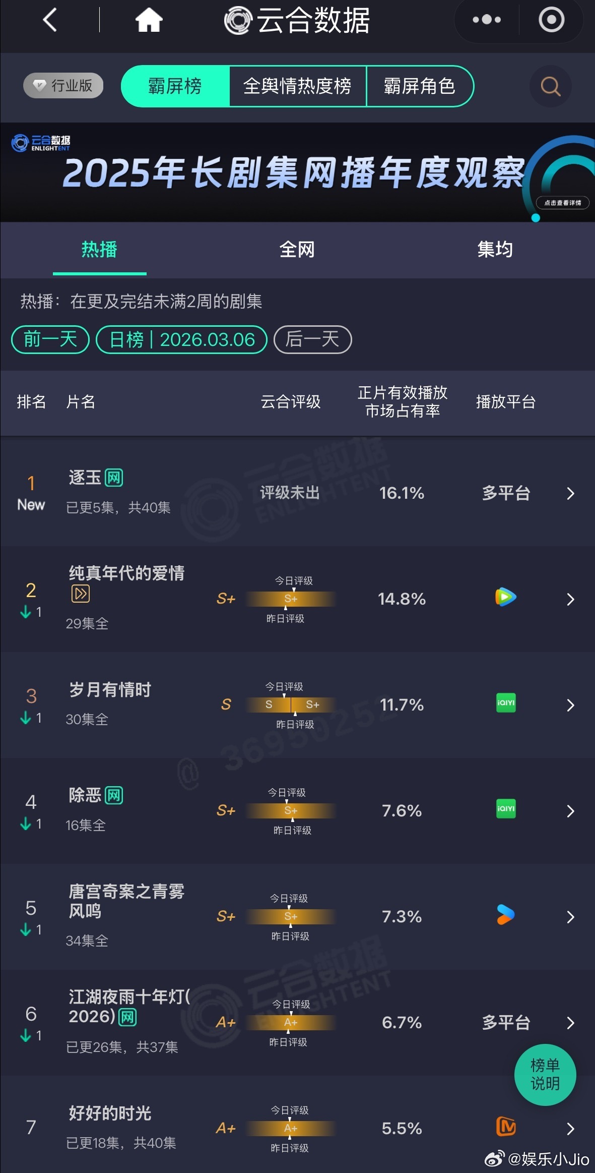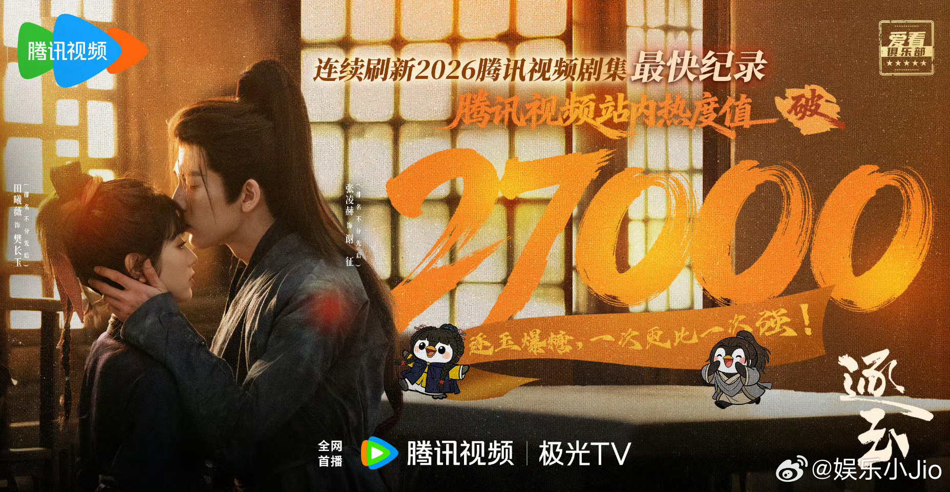 开播第一天就云合16.1% 登顶,爱奇艺热度破9000,腾讯热度破27000,刷新了两个平台2026的最快纪录。这个逐玉已经不是爆开高走了,现在是爆开疯走