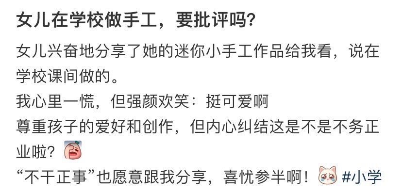 夕暮 2 2026-03-08 11:22 批评啥,引导一下就行了。小时候我爸妈一看见我课外时间做手工就炸毛(当时我成绩是前几的),骂人扔东西算轻的,万一本来心情就不好更会揍我。童年时期我的动手能力老师都说好的,后面挨揍次数多了就不敢做了。等年纪大了被我妈唠唠叨叨为什么别人家孩子动手能力强,你就干啥啥不行。我:怪我喽?。。。顺便一提,当年我爸看见我做针线活就会生气,现在让我给他缝扣子补衣服倒是自然得很