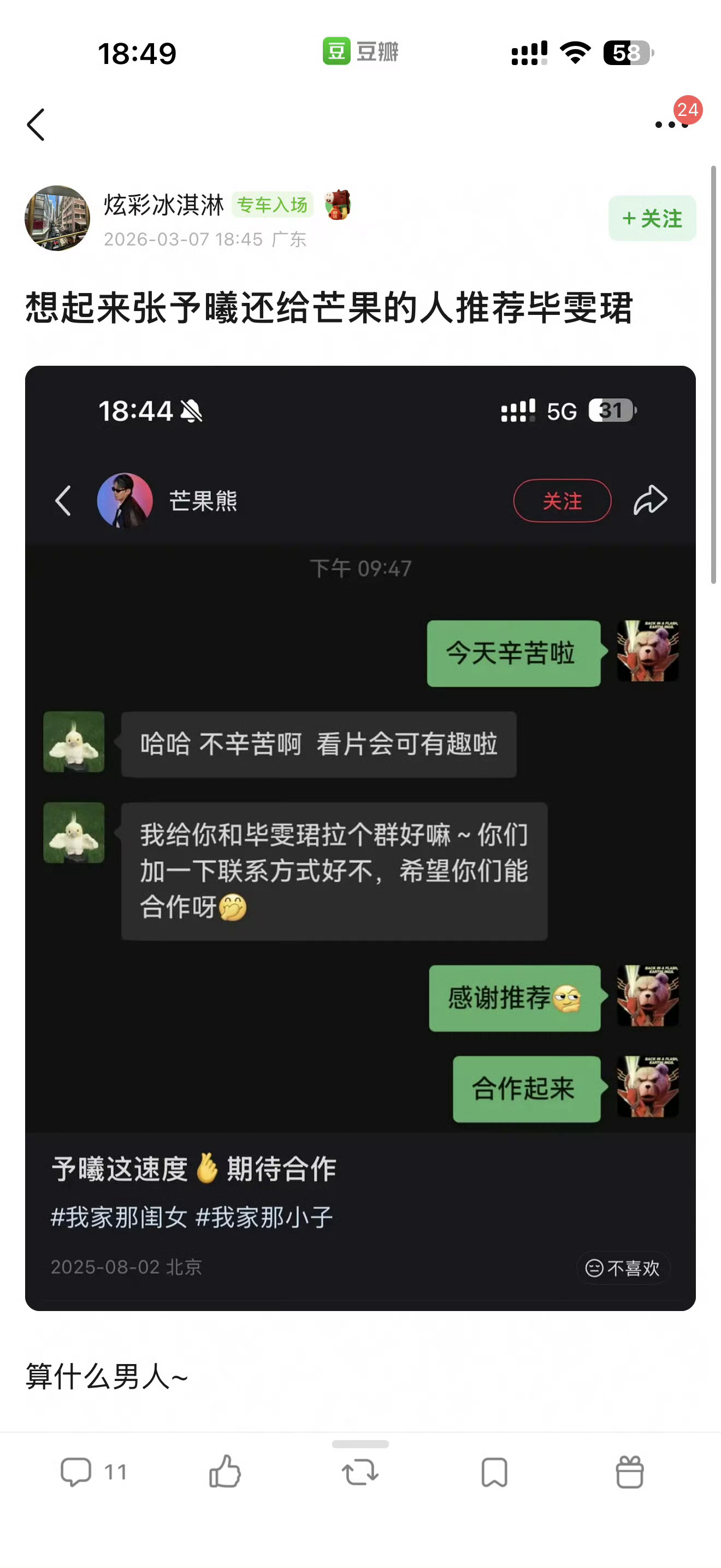 毕雯珺 张予曦小哥哥在偶练卡位没出道后就一直没什么水花,这么多年了也就去年的深情眼有点热度,靠CP起家的就别忘本好嘛,和大美女合作整的像多委屈你似的人家还给你介绍工作呐