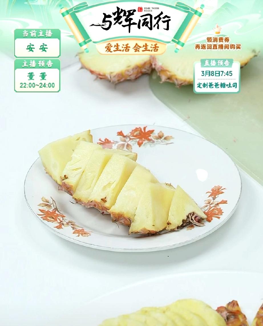 凤梨原来还可以这么切,这大概是我见到的最简单的切凤梨的方法。最惊奇的是与辉同行居然有这么富有年代感的盘子。这个盘子的花色大概是上个世纪八九十年代的,真的很复古哟。 刚开始听安安说要教大家一个切凤梨的方法,我还以为有点难度,没想到这么简单。之前都是在超市或者水果店买凤梨,然后让工作人员削好皮带回家。看了安安的方法,以后也可以多网购一点,放在家里,随吃随切了。 董宇辉 与辉同行