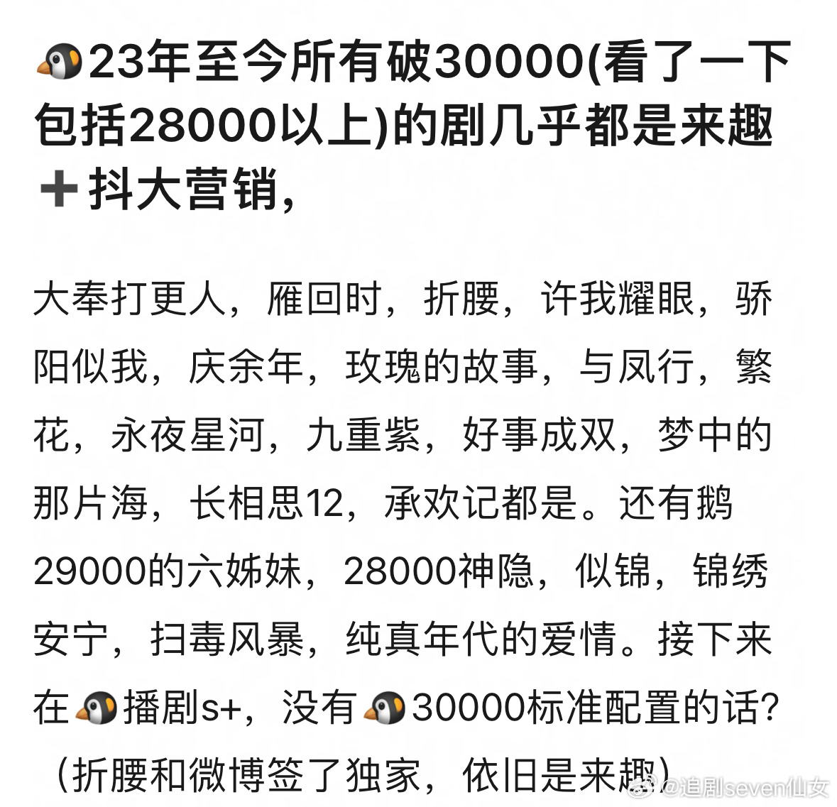 来趣这个营销公司下剧的数据有失手过吗?不仅鹅桃,在播剧也是来趣,👖的很多强yx剧比如自嗨传也出自来趣…